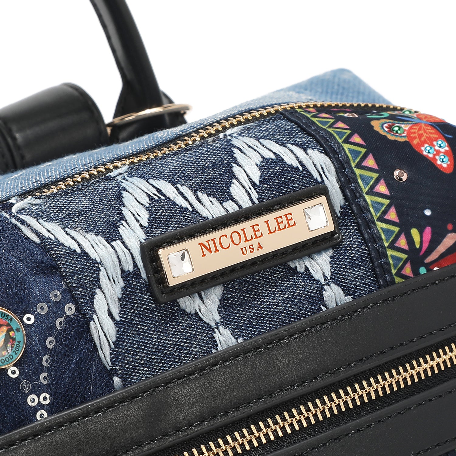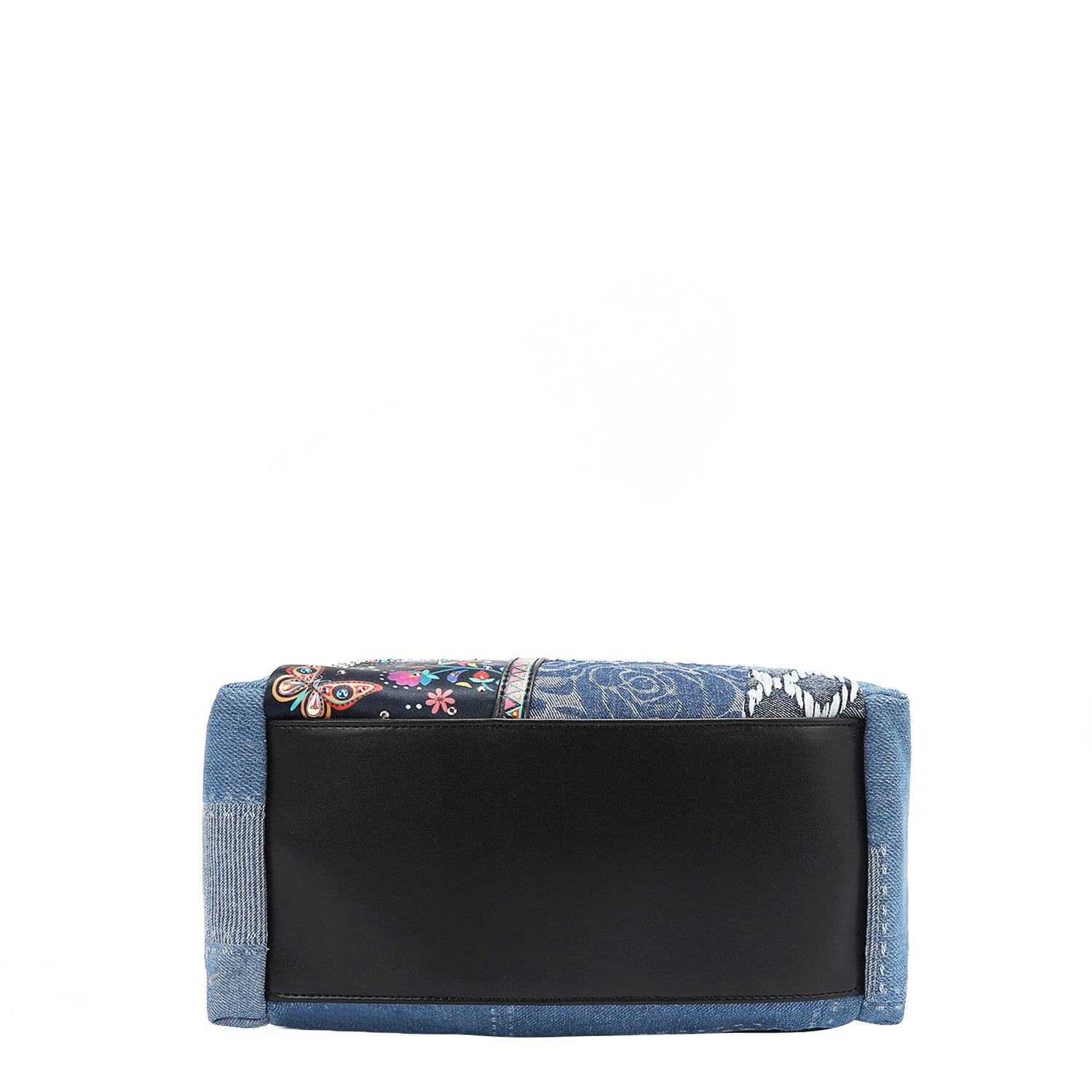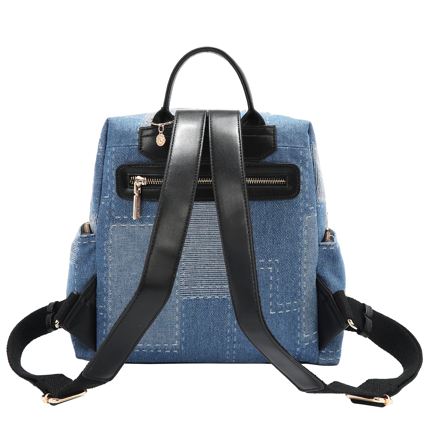 - Cotton denim exterior with faux vegan leather accents