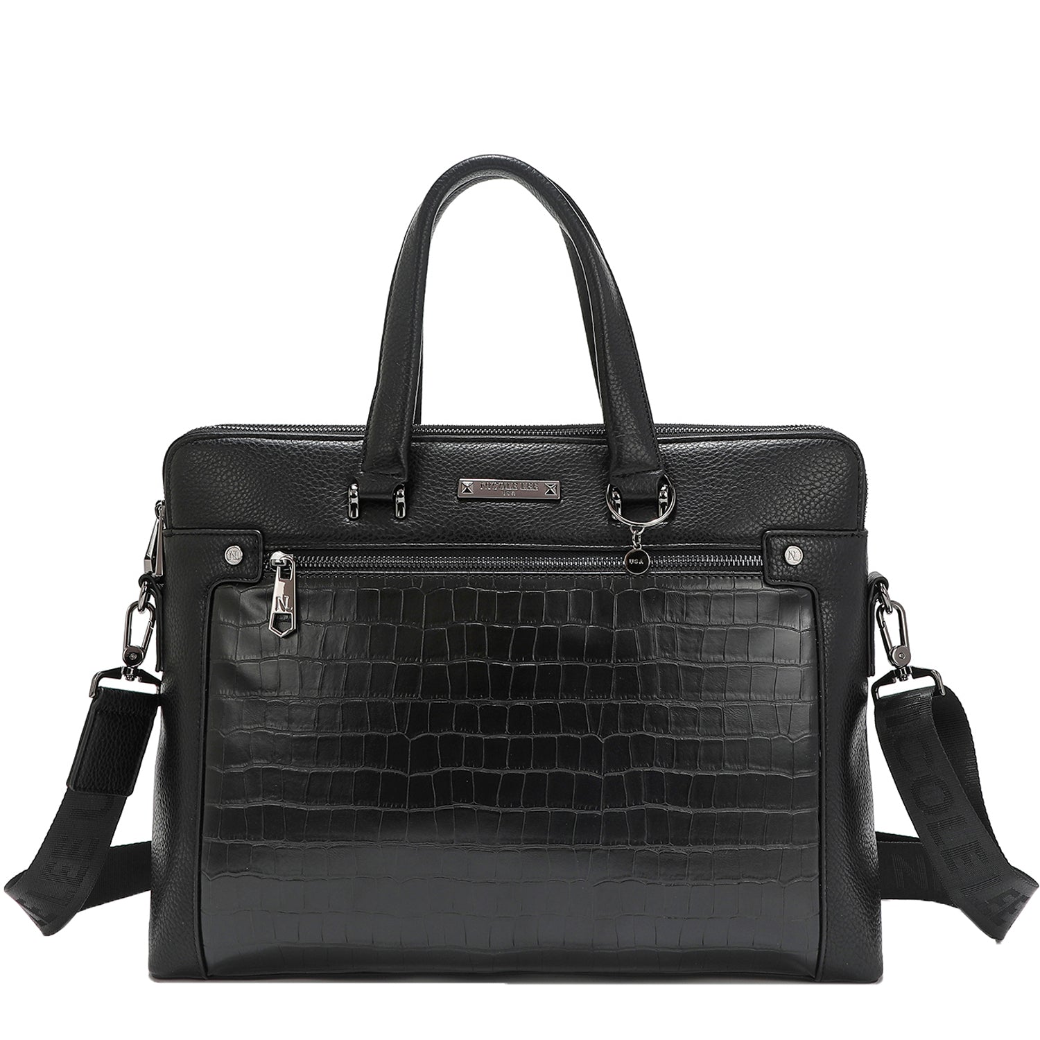 - Gunmetal-tone hardware