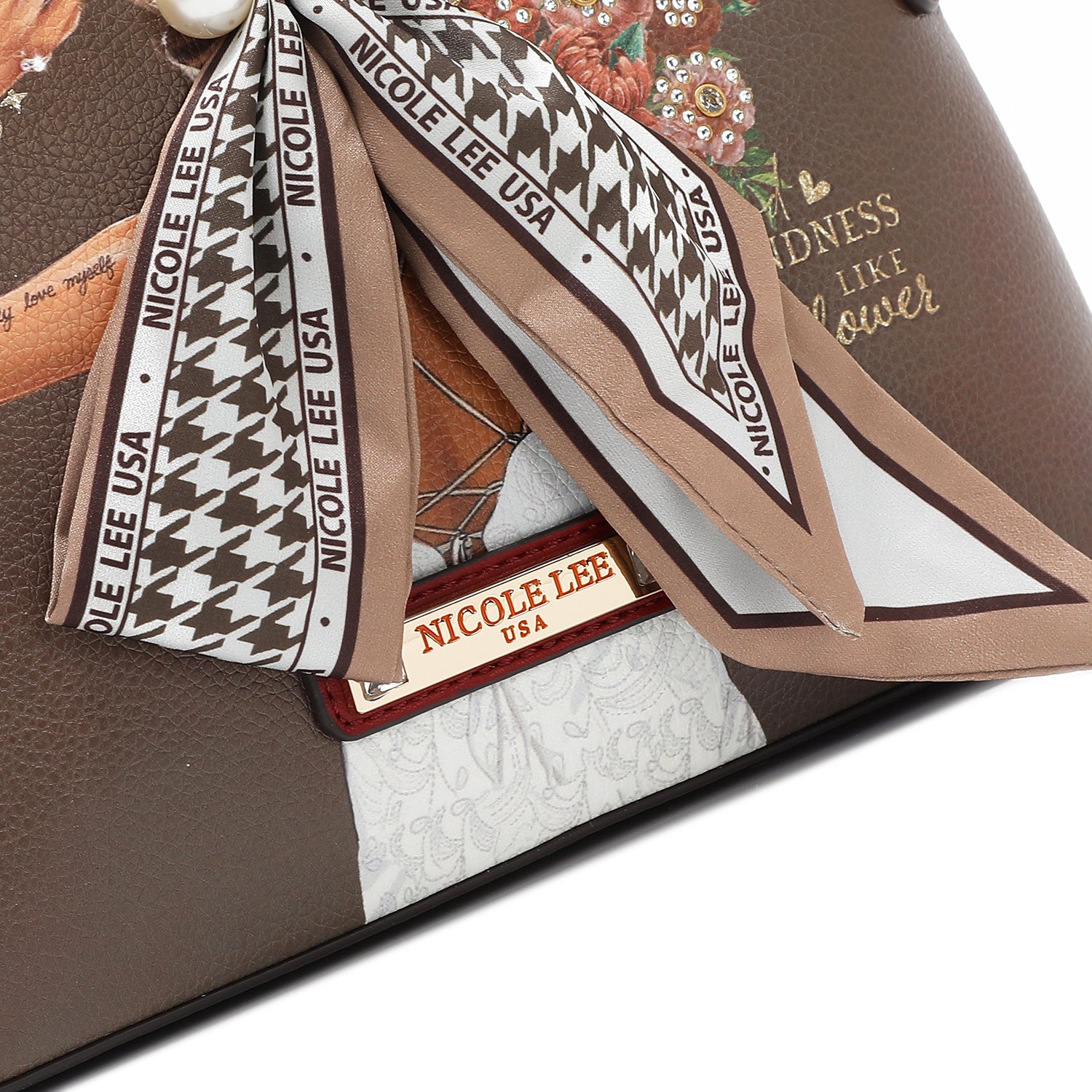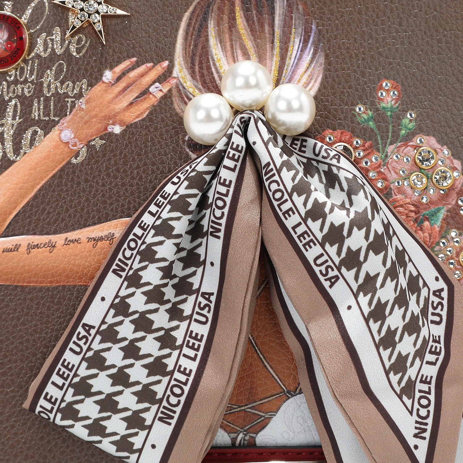 - Front is embellished with faux pearls, diamond rhinestones, and scarf detail