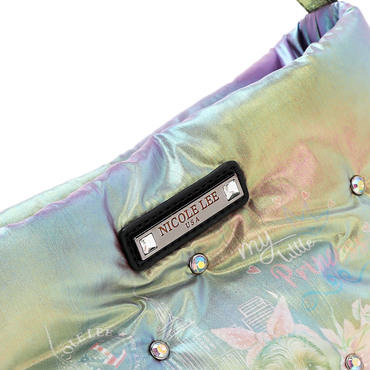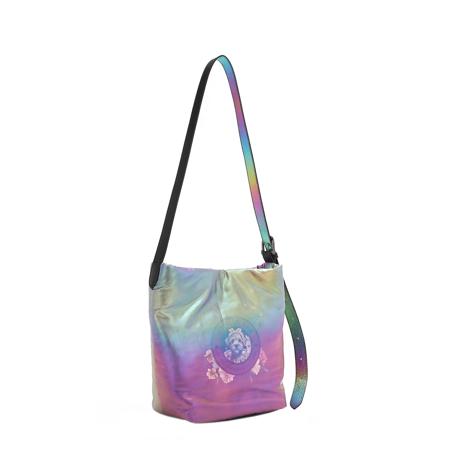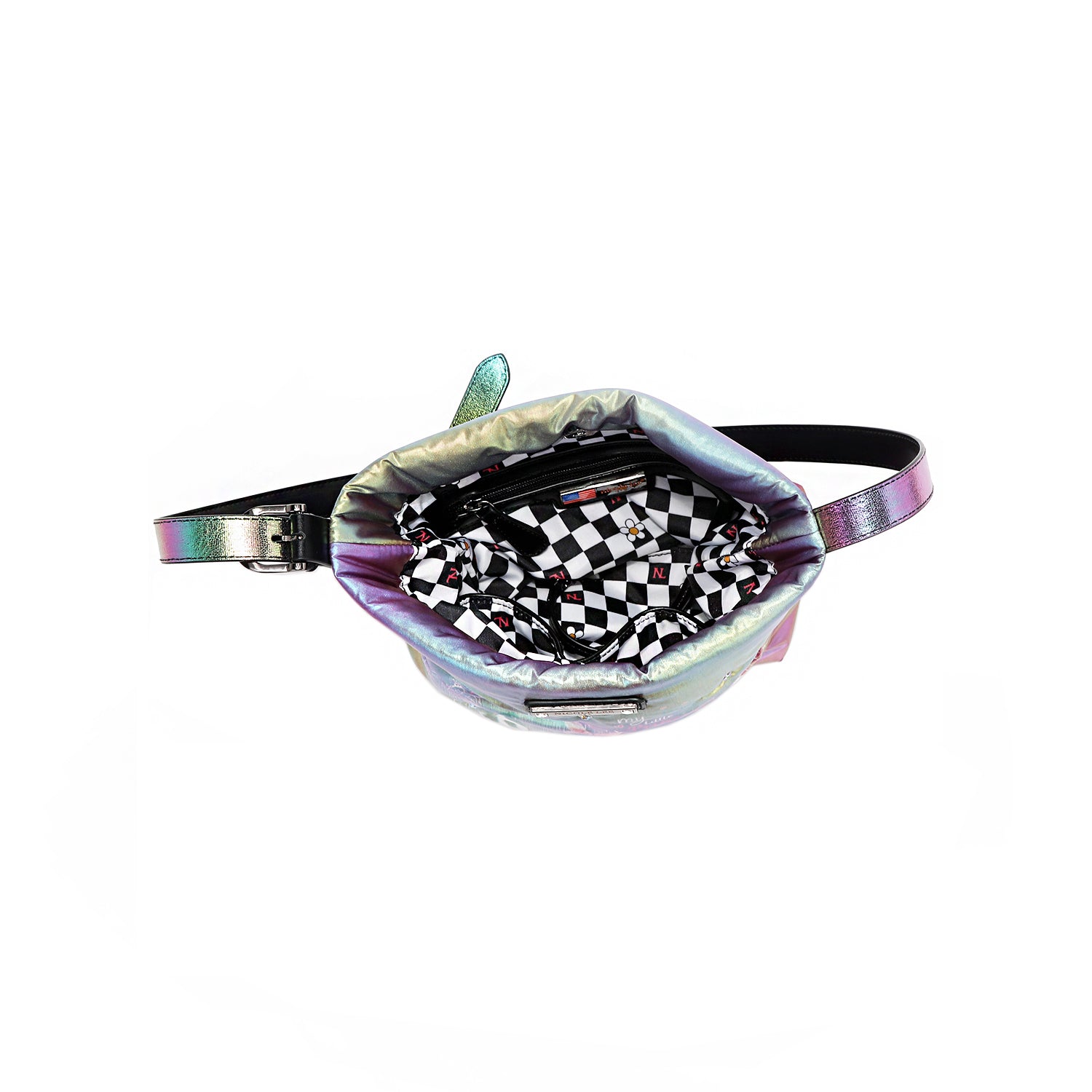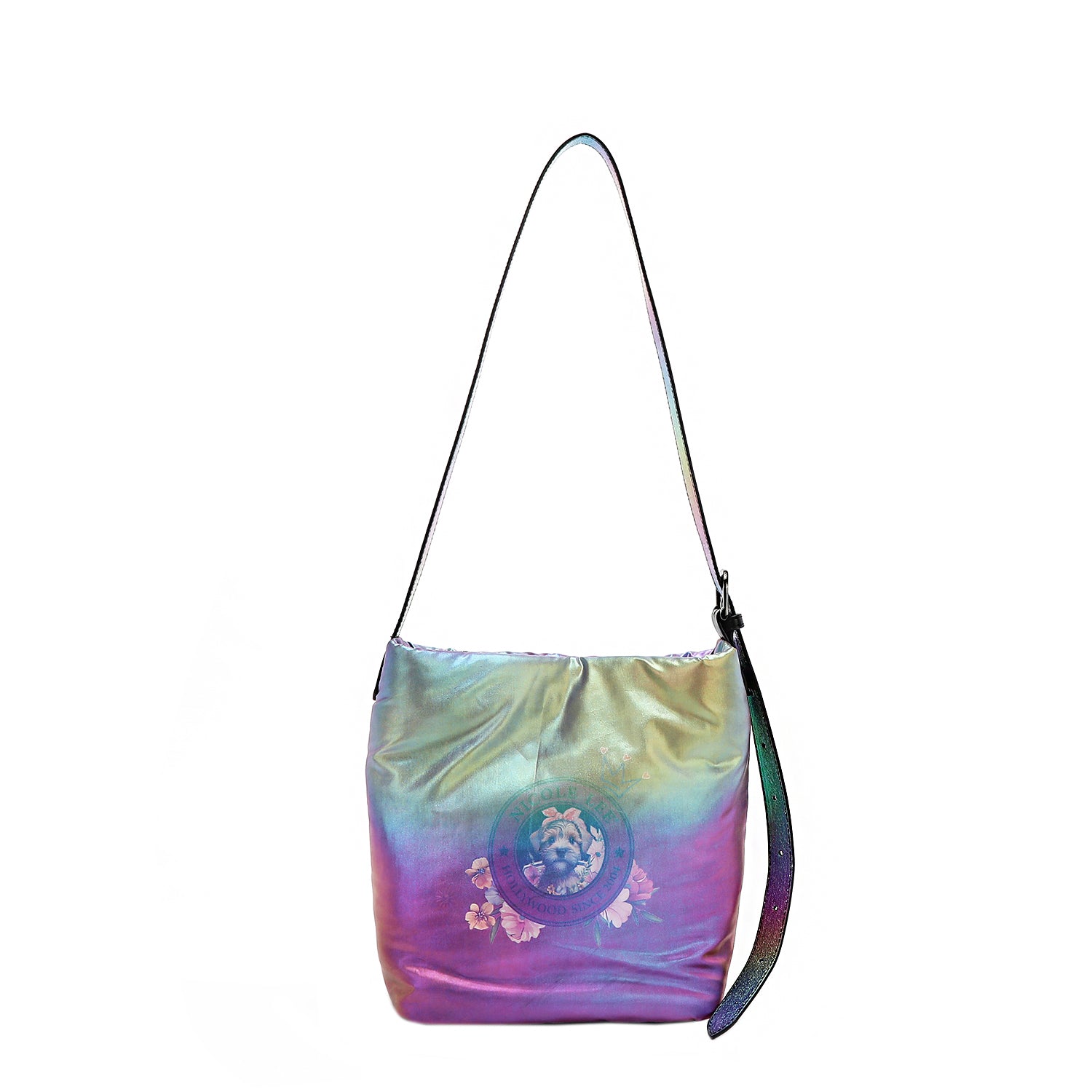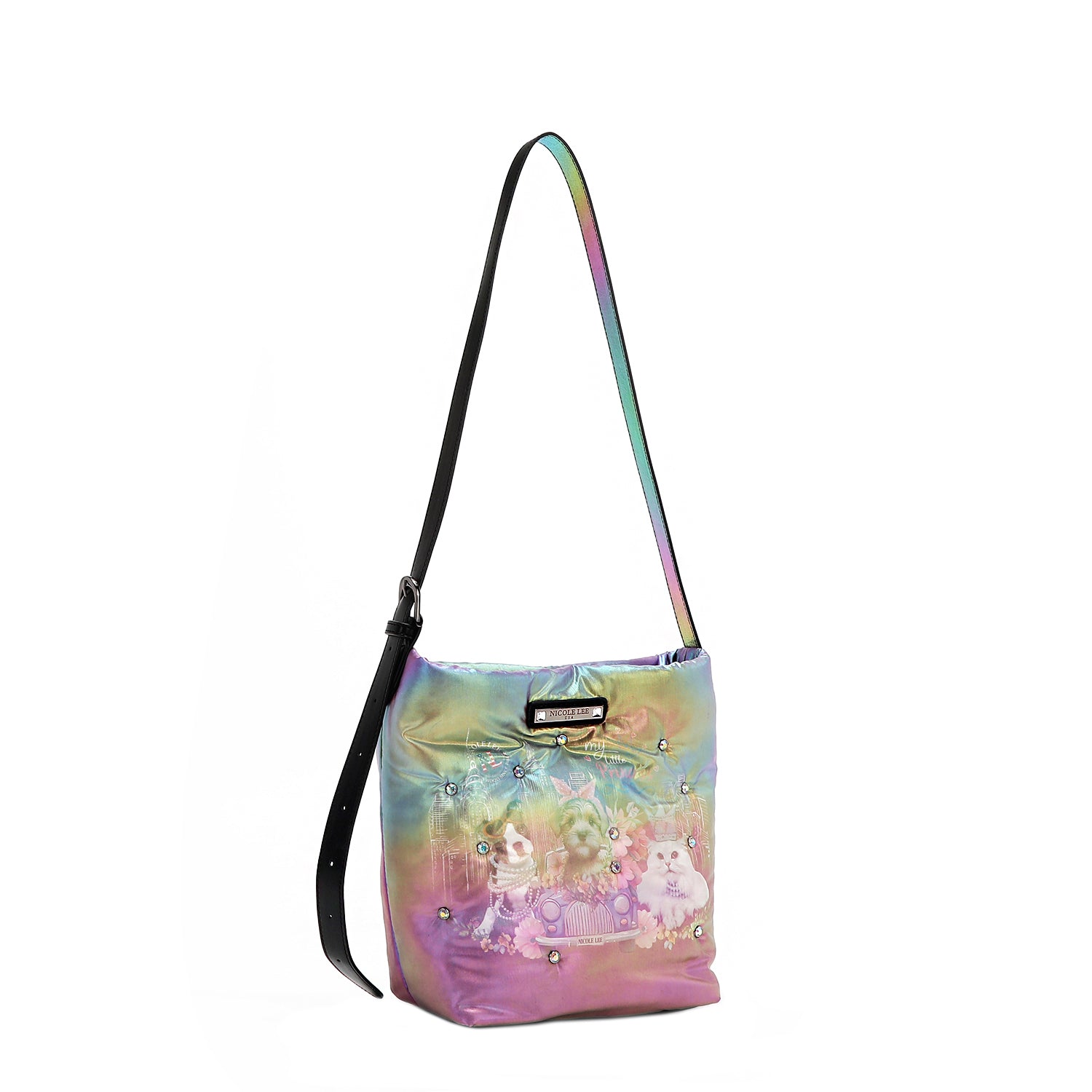 Our iridescent nylon bucket crossbody dazzles with an ethereal shimmer, adorned with iridescent diamond rhinestones for a touch of romance and charm. This enchanting icon combines an eye-catching finish with an extravagantly dreamy design, perfect for those who love a hint of sparkle.