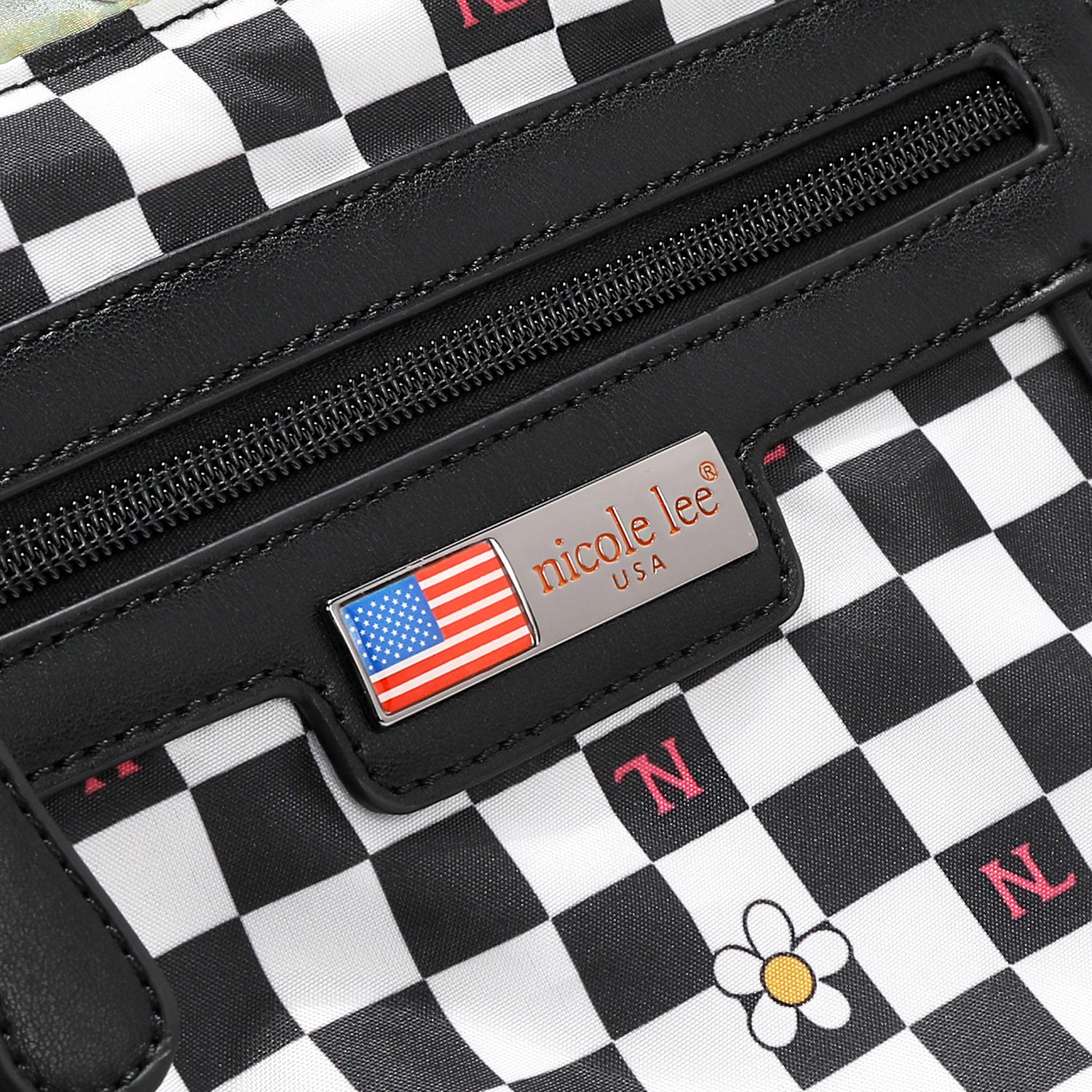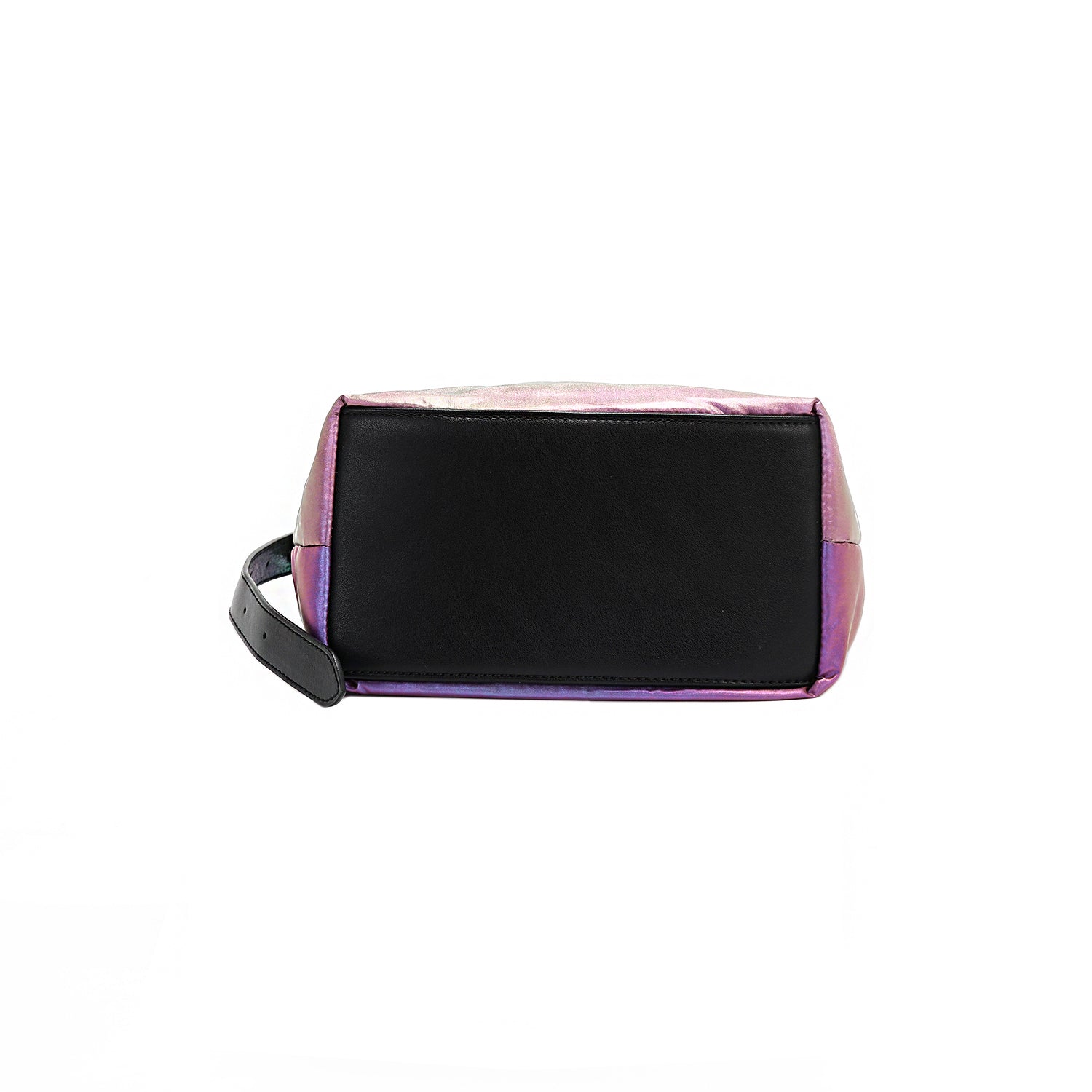- Lightweight nylon exterior with iridescent shimmer finish and vegan leather accents