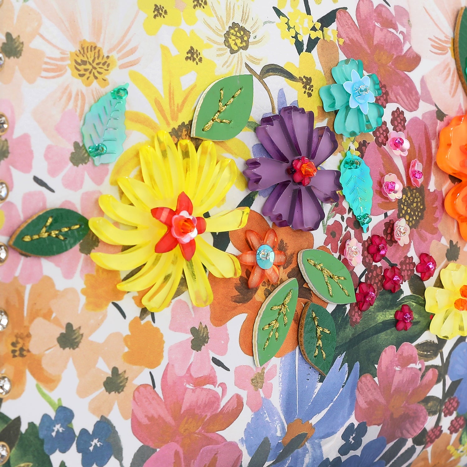 - Front is embellished with resin flowers, sequins, beads, and appliques