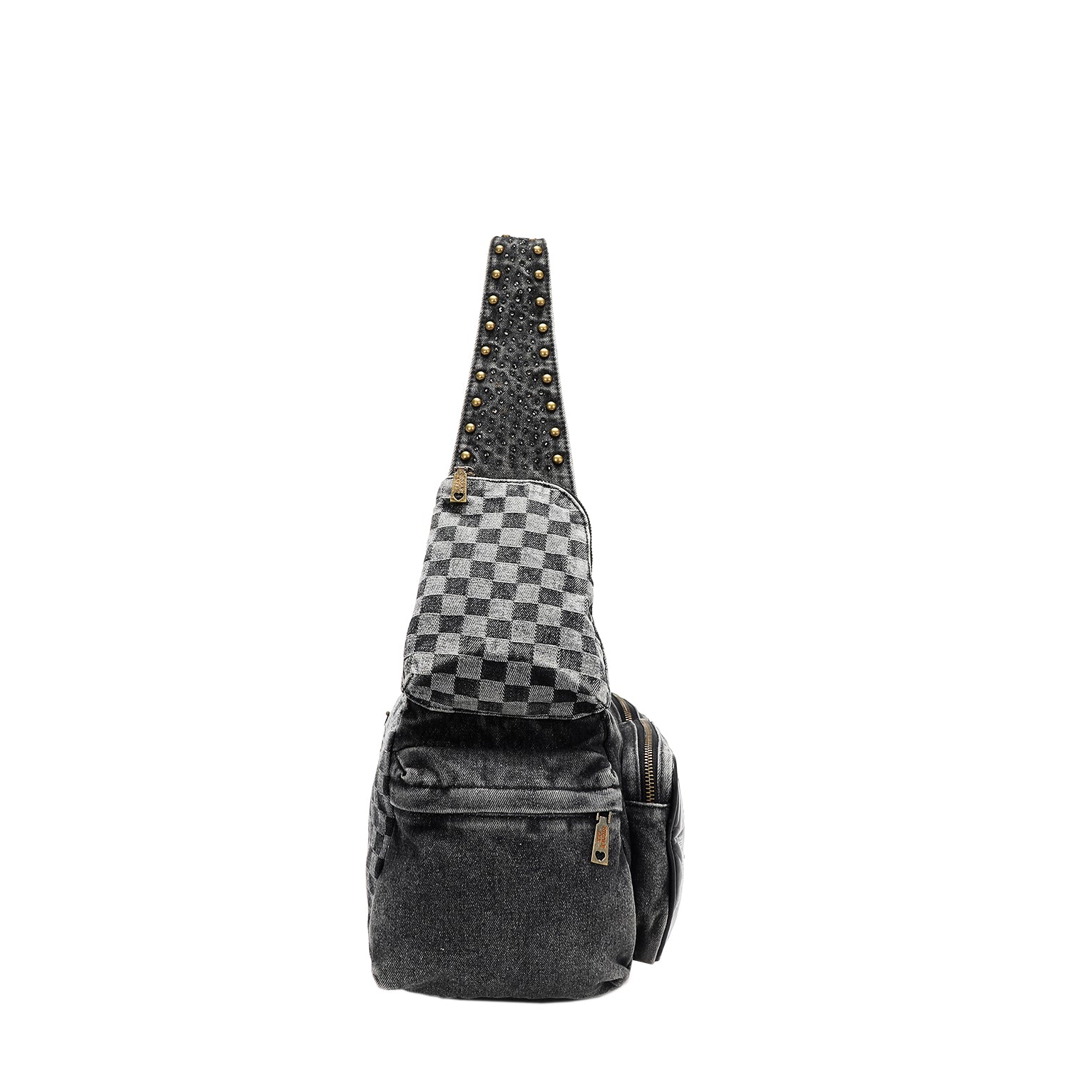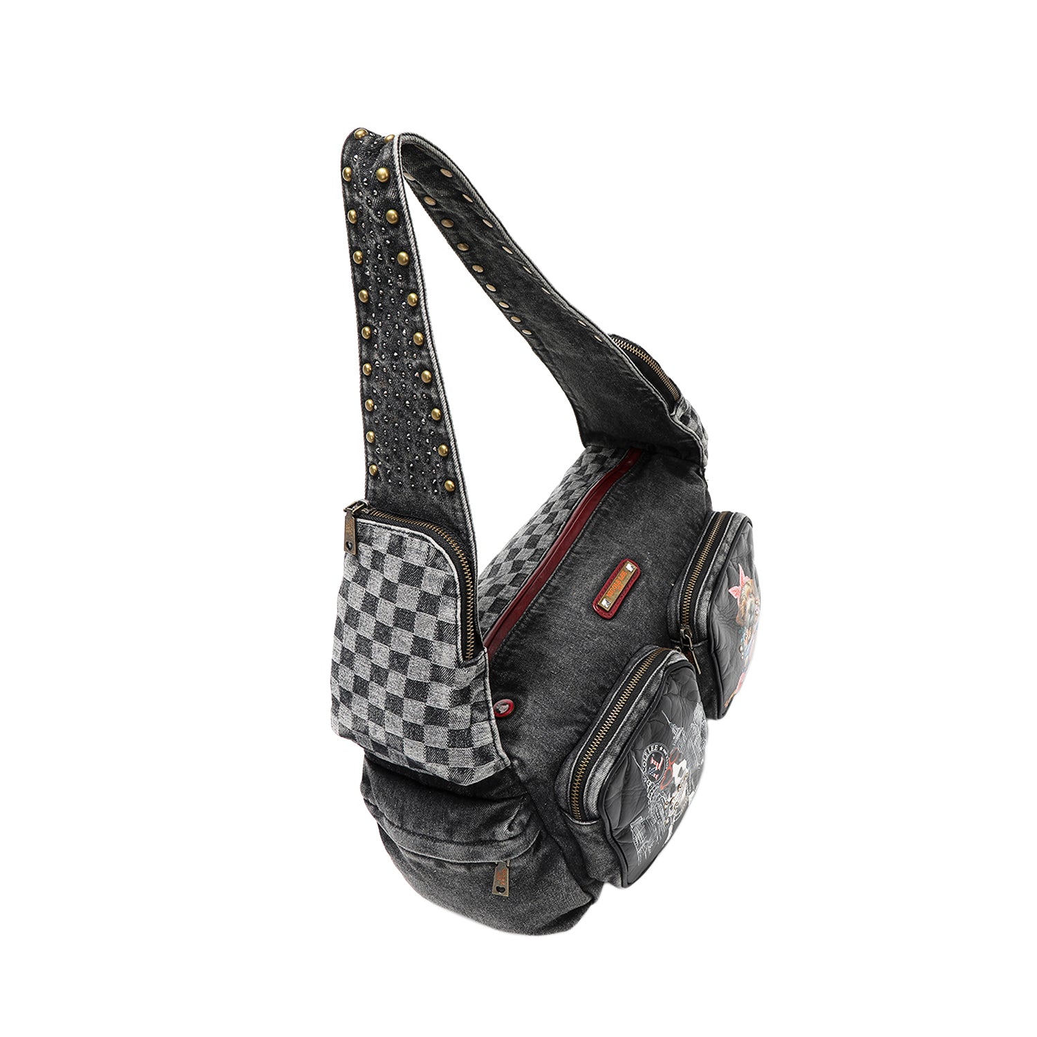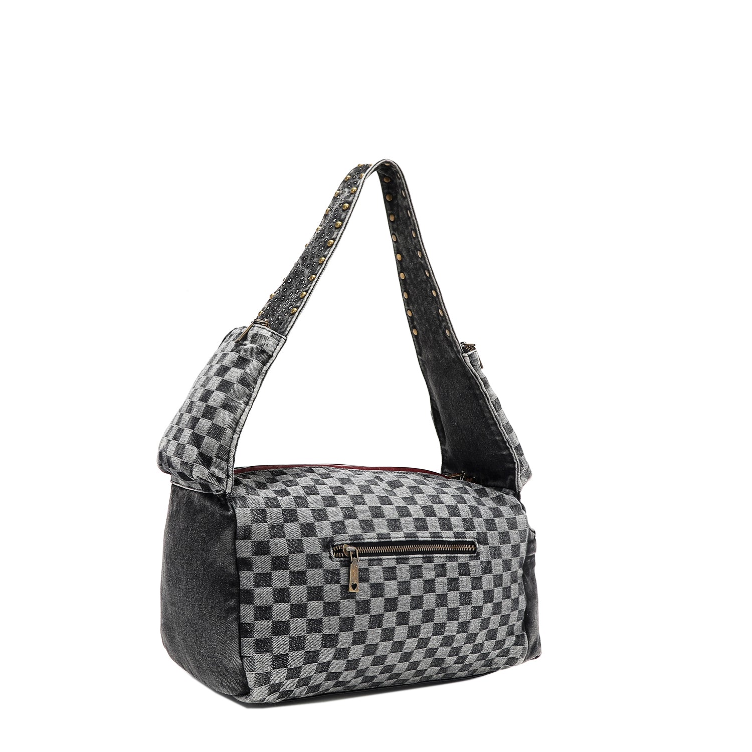 - Studded shoulder strap with side zip pockets (16.5" drop)