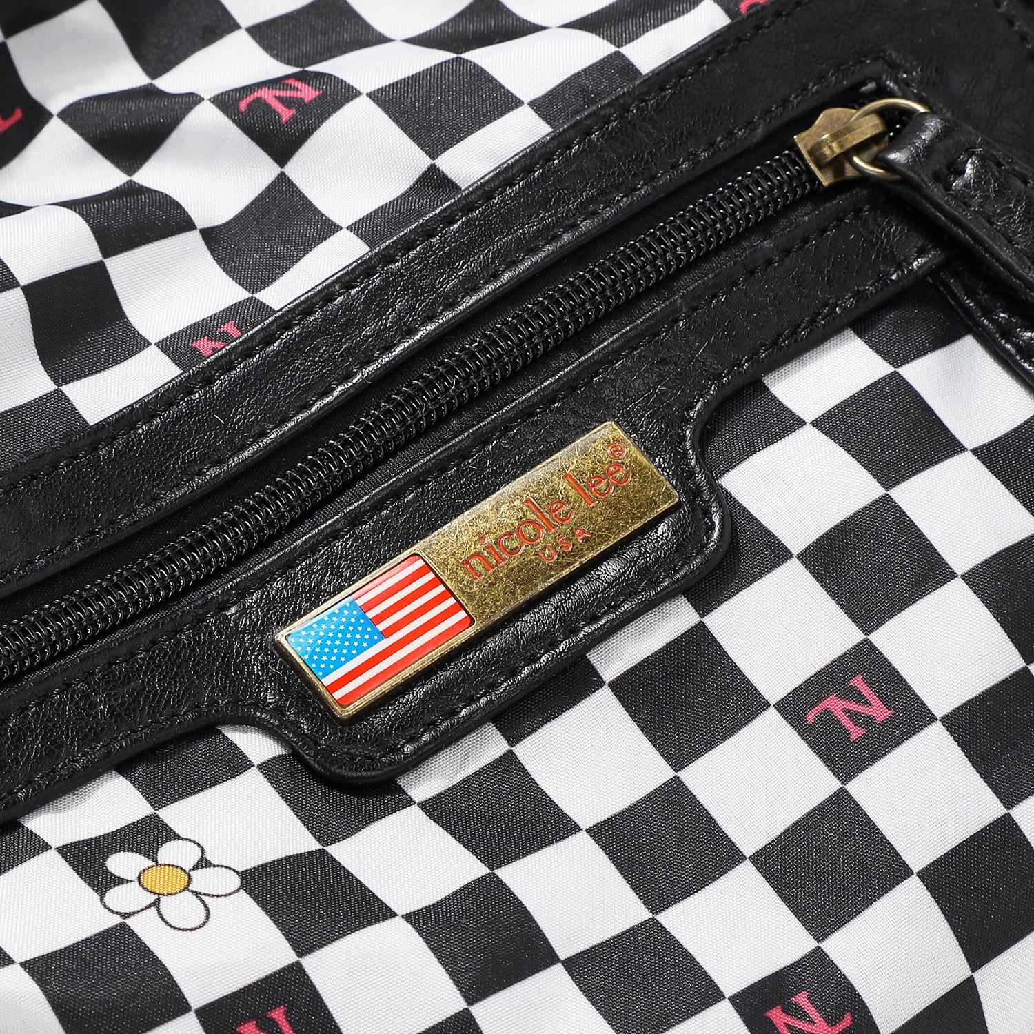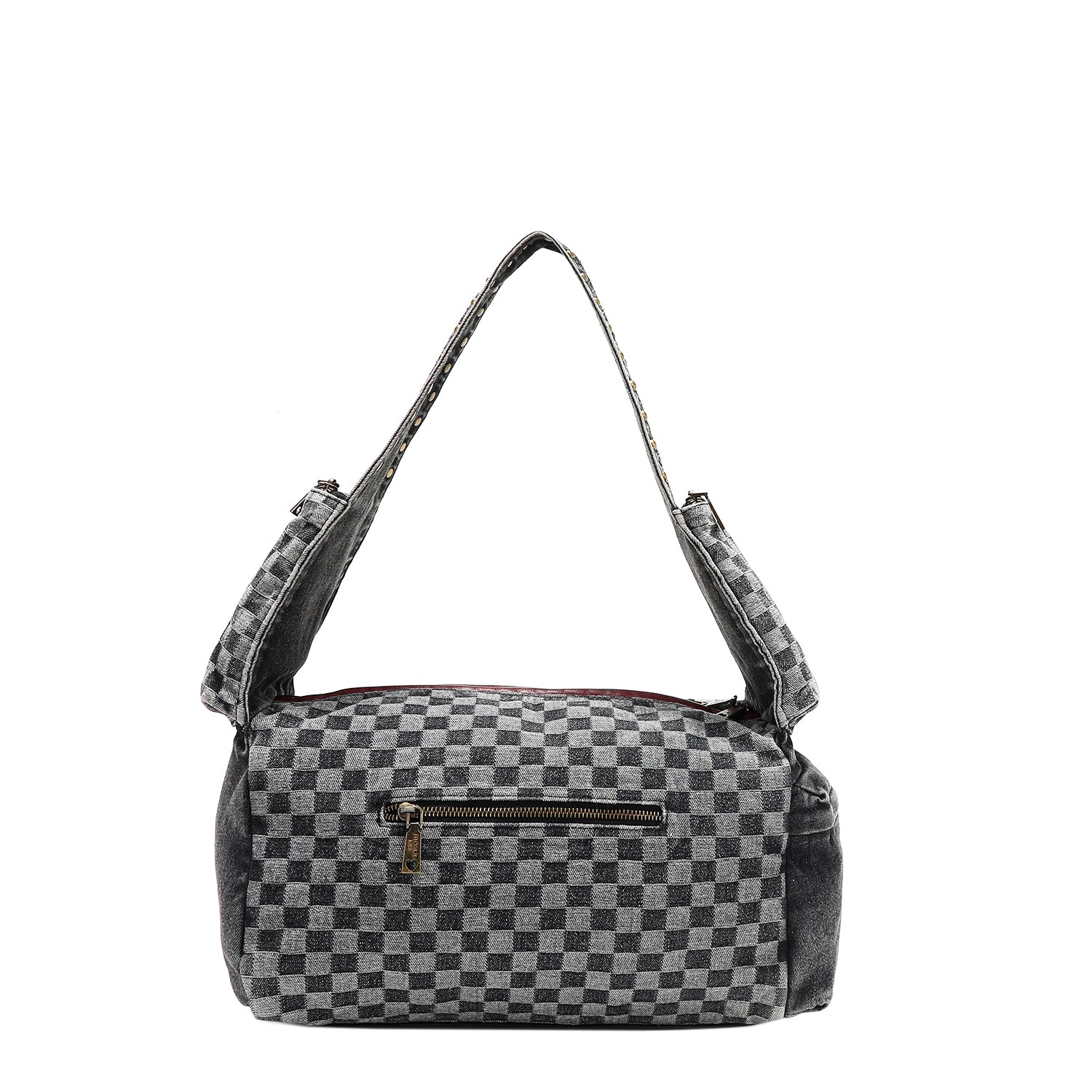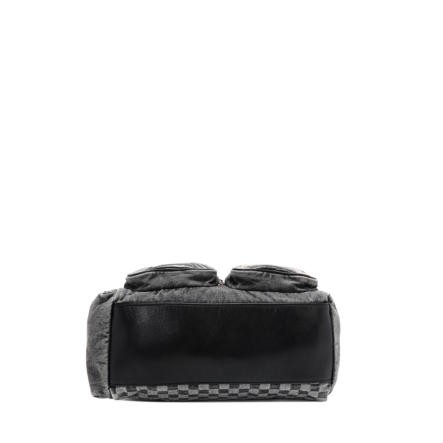 - Studded shoulder strap with side zip pockets (16.5" drop)