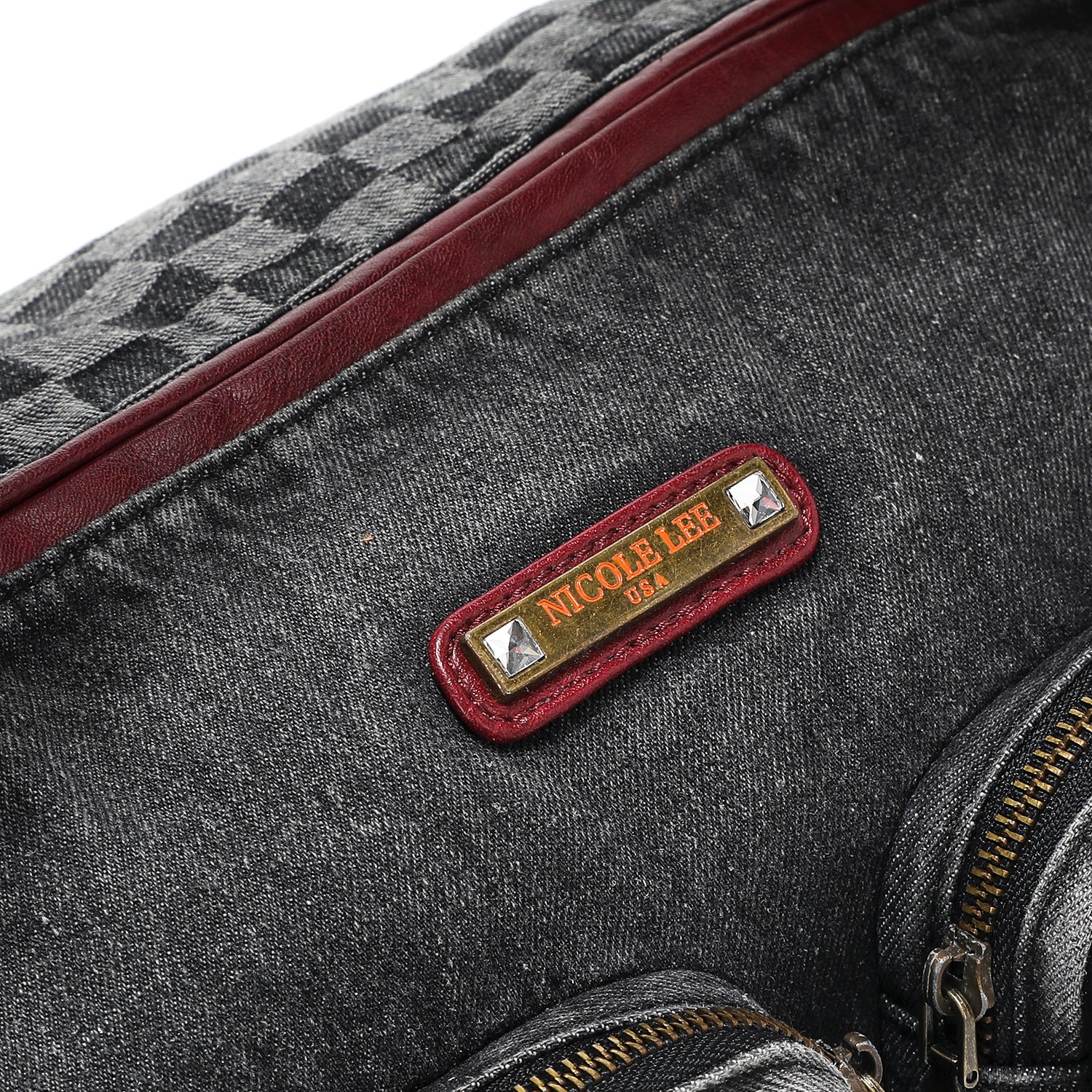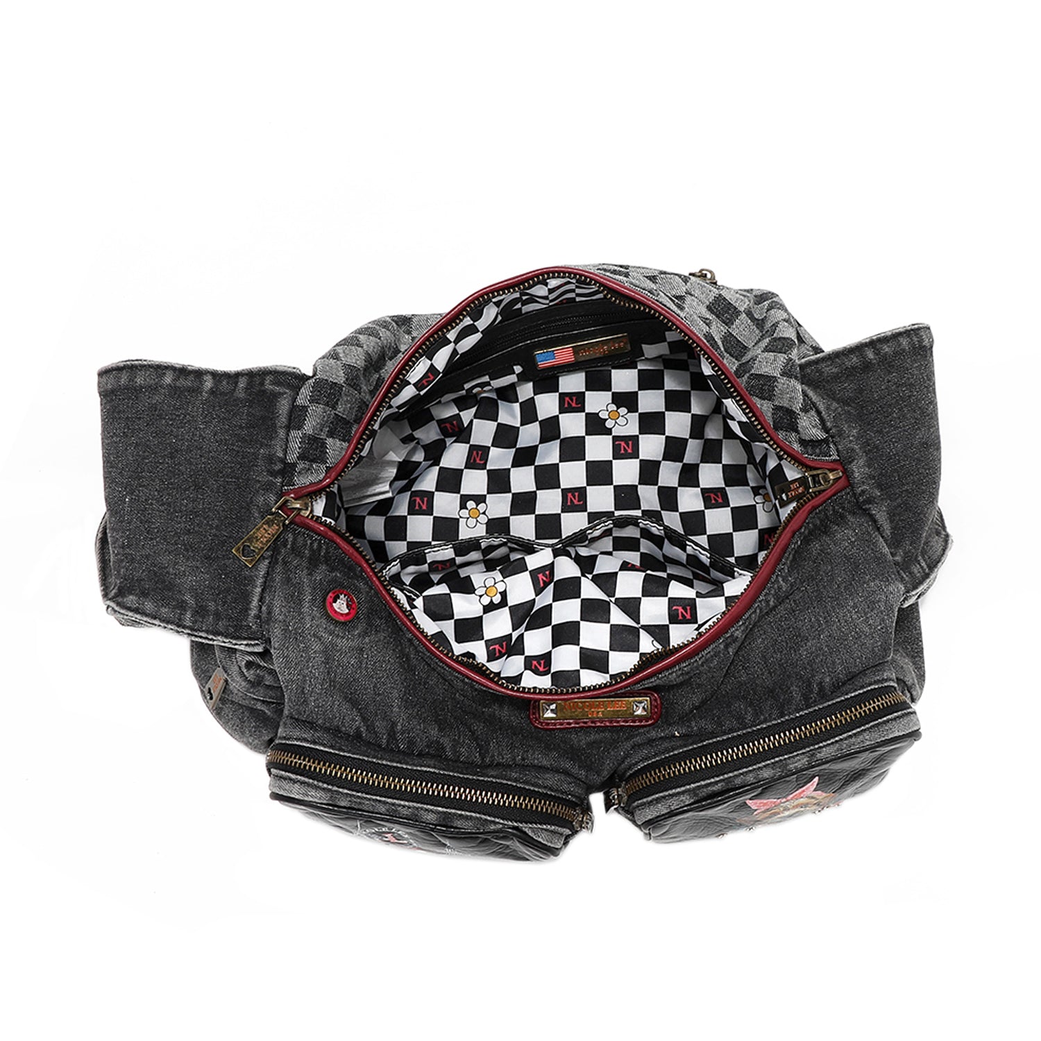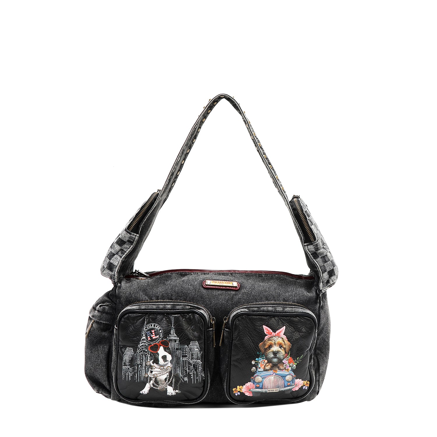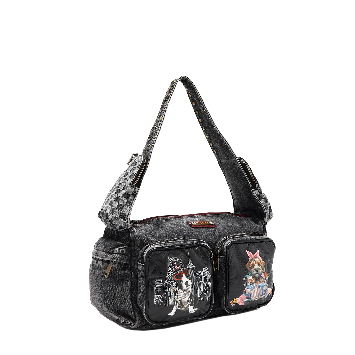 The Family Yearbook denim shoulder bag is spacious and stylish, featuring zip pockets on the beautifully embellished wide shoulder strap—studded with tonal rhinestones for a chic touch. Perfect for keeping essentials like earbuds, lipstick, and money close at hand!