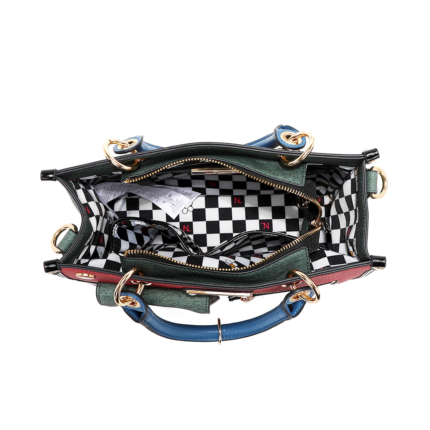 - Vegan leather exterior with faux denim and glossy patent leather accents