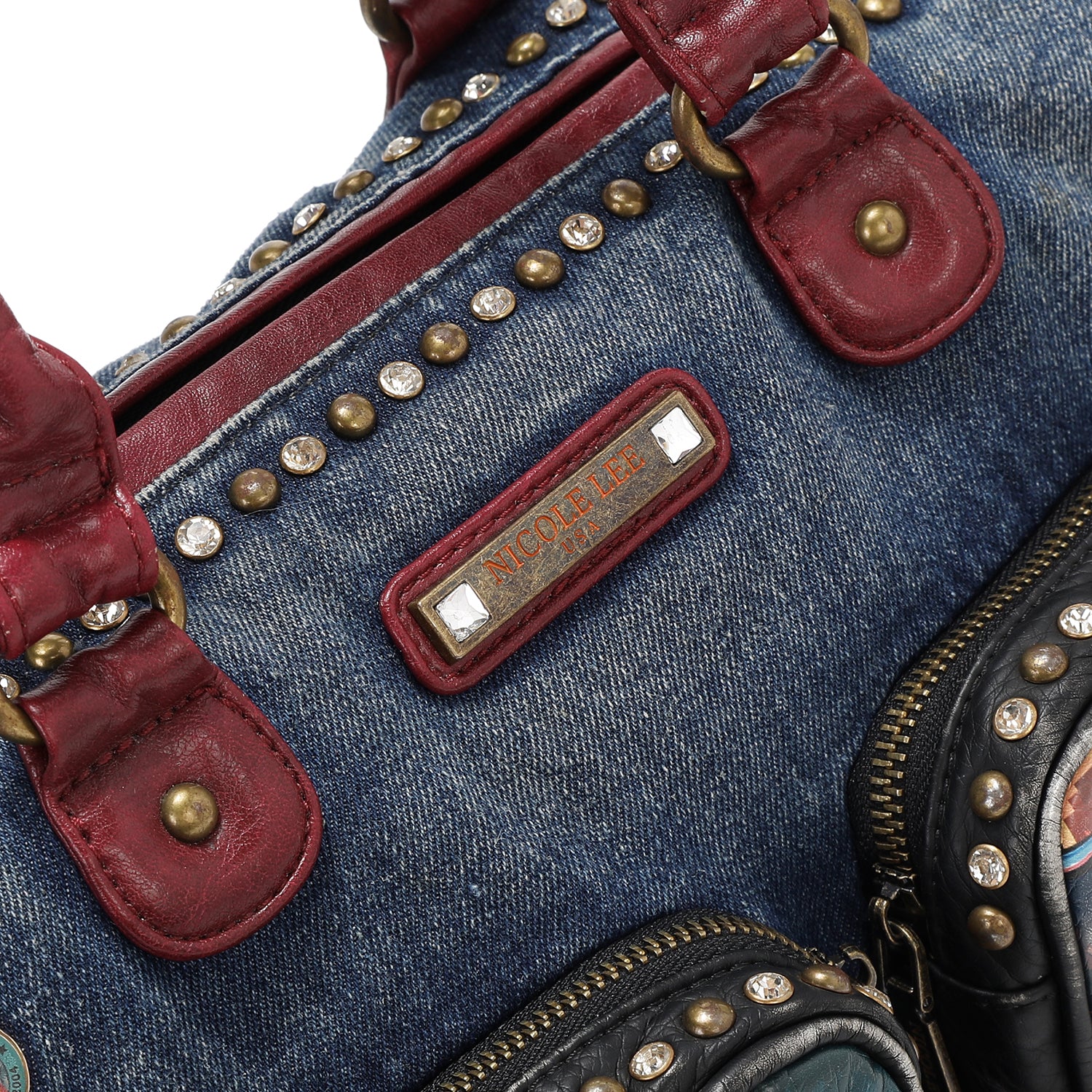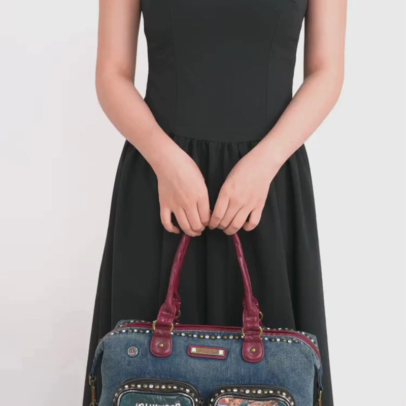 The perfect blend of bold and chic, our Hollywood Drive studded handbag is crafted from distressed washed denim with vegan leather accents and brass-tone hardware for a casual yet trendsetting look. The two front pockets add functionality and flair, making it a striking accessory for any wardrobe.