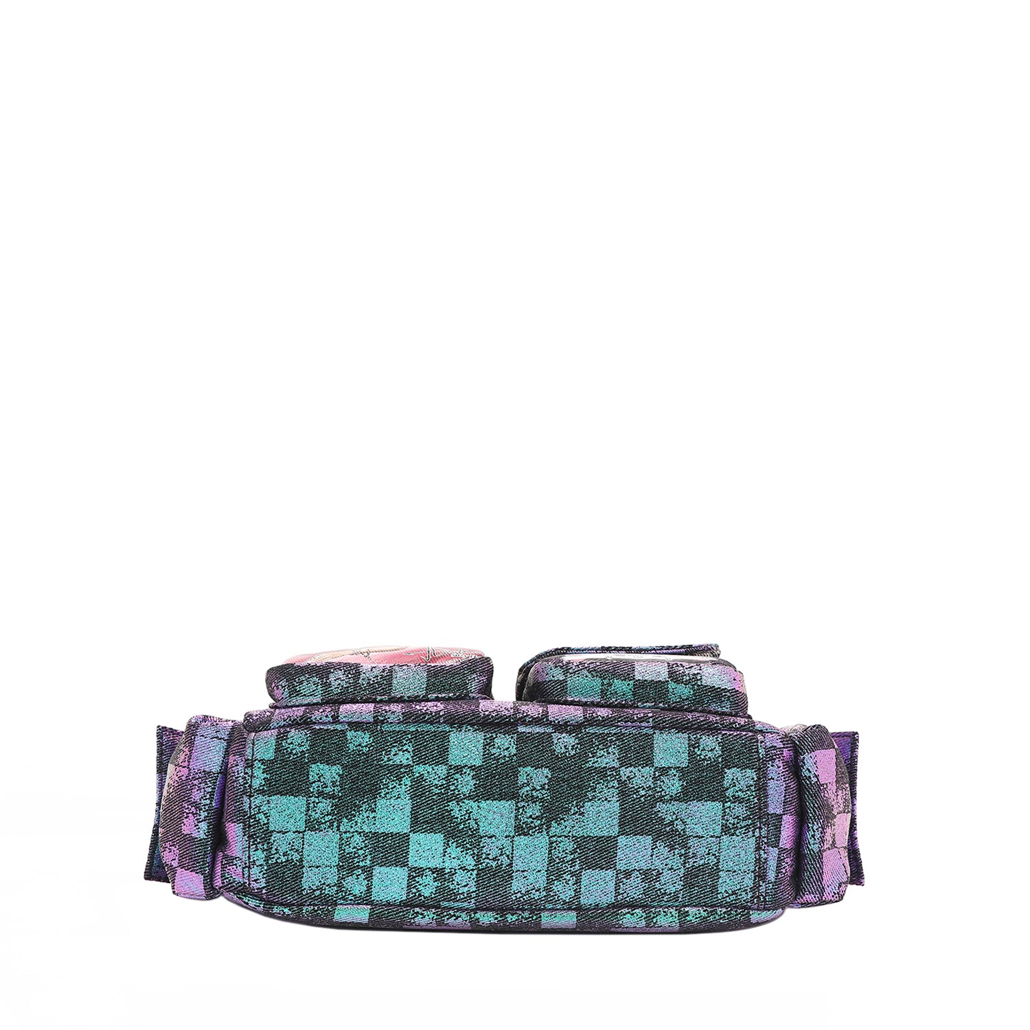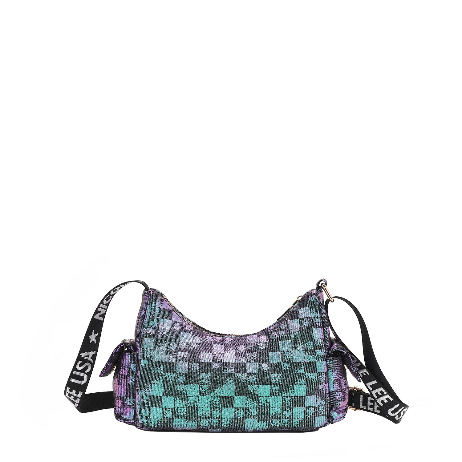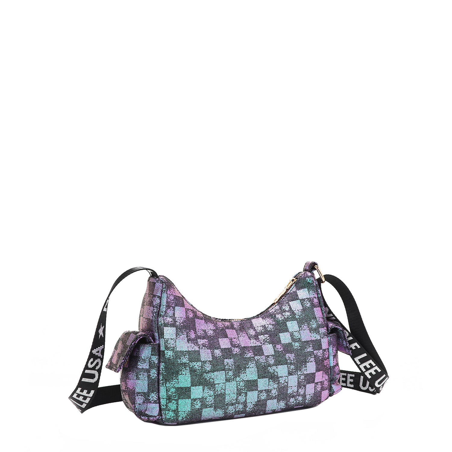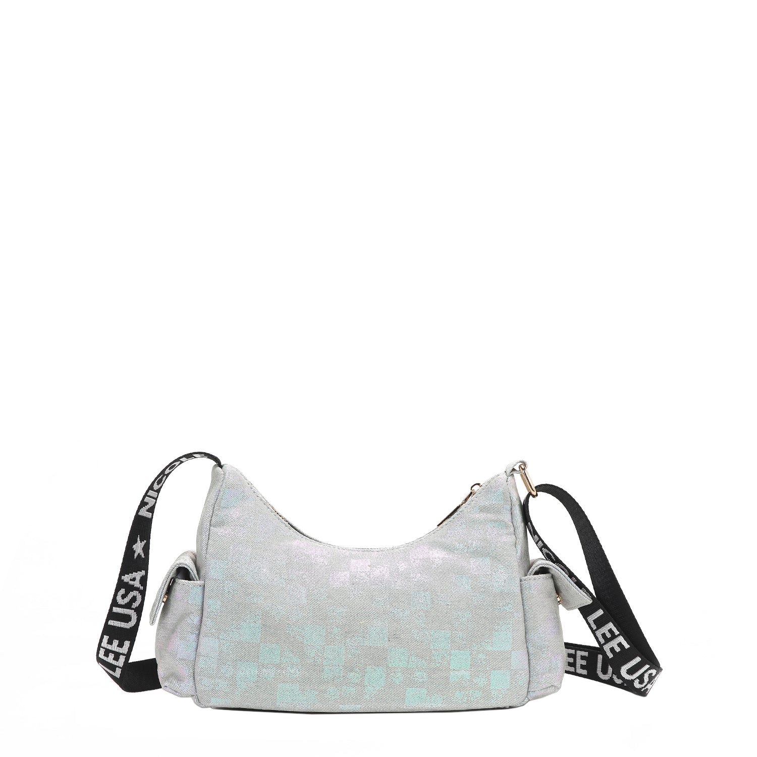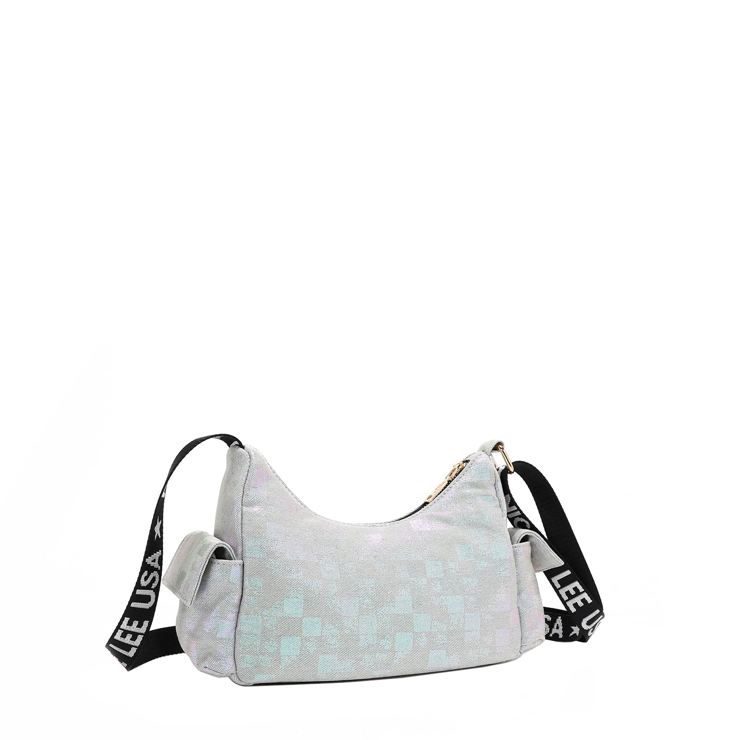 Discover our crescent-shaped checker denim shoulder bag, featuring all-around pockets for optimal organization and a sized-down interior perfect for carrying just the essentials.