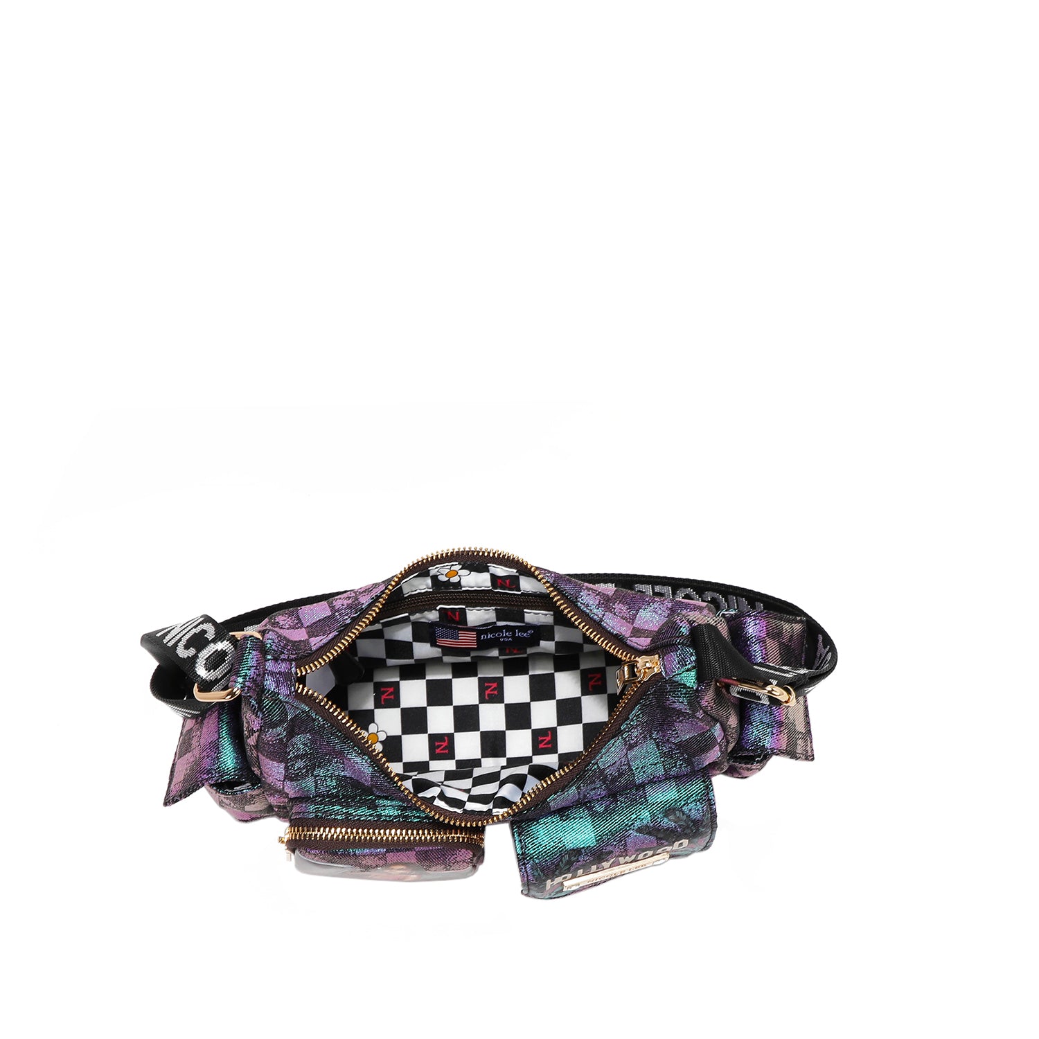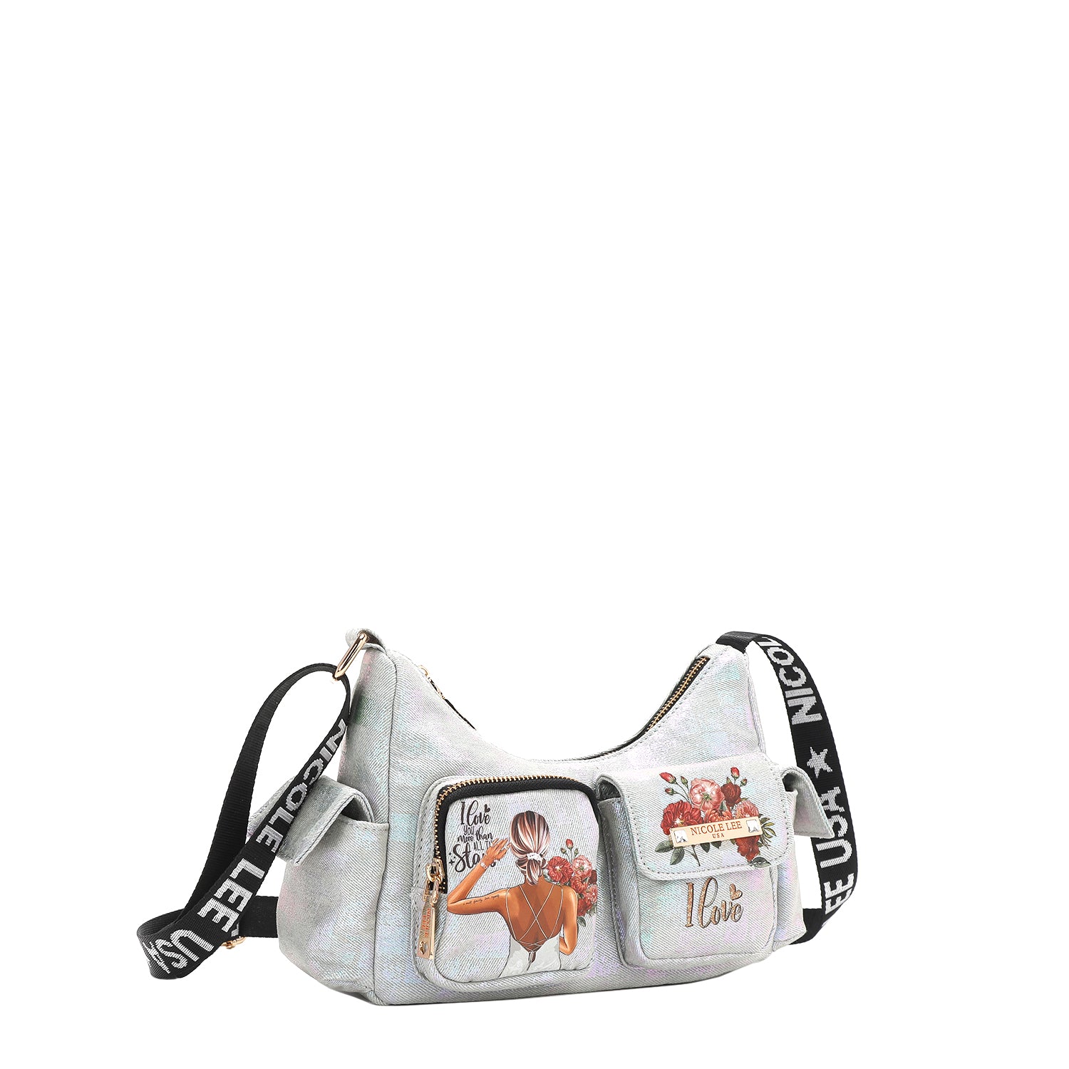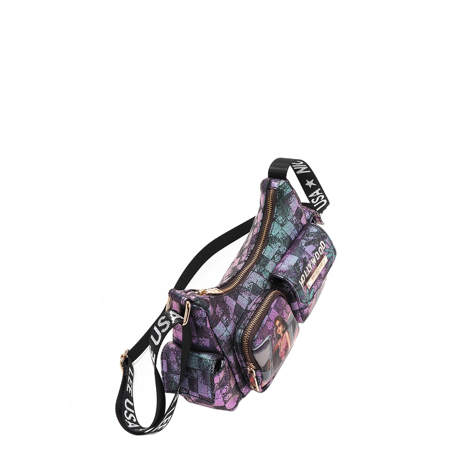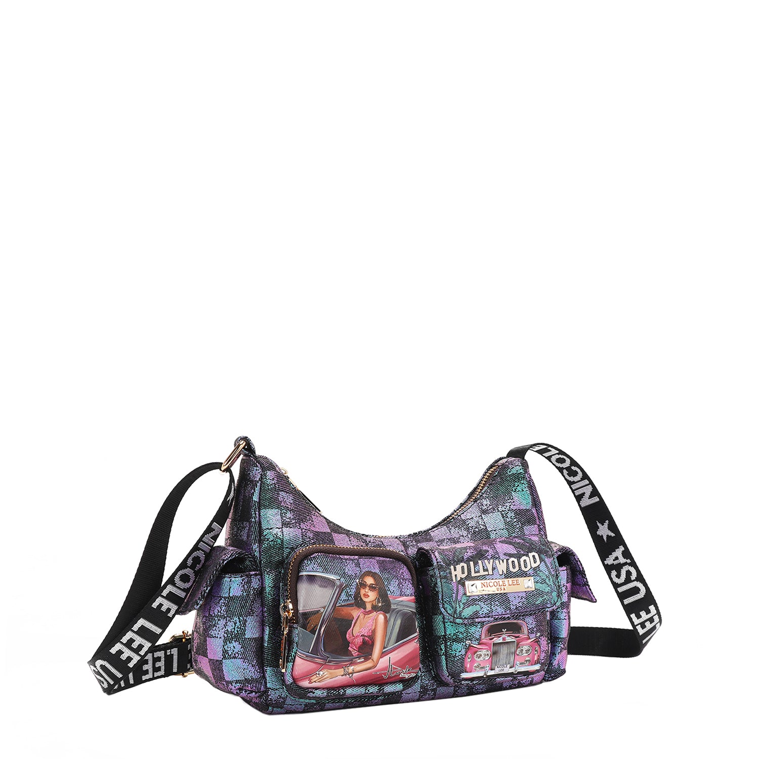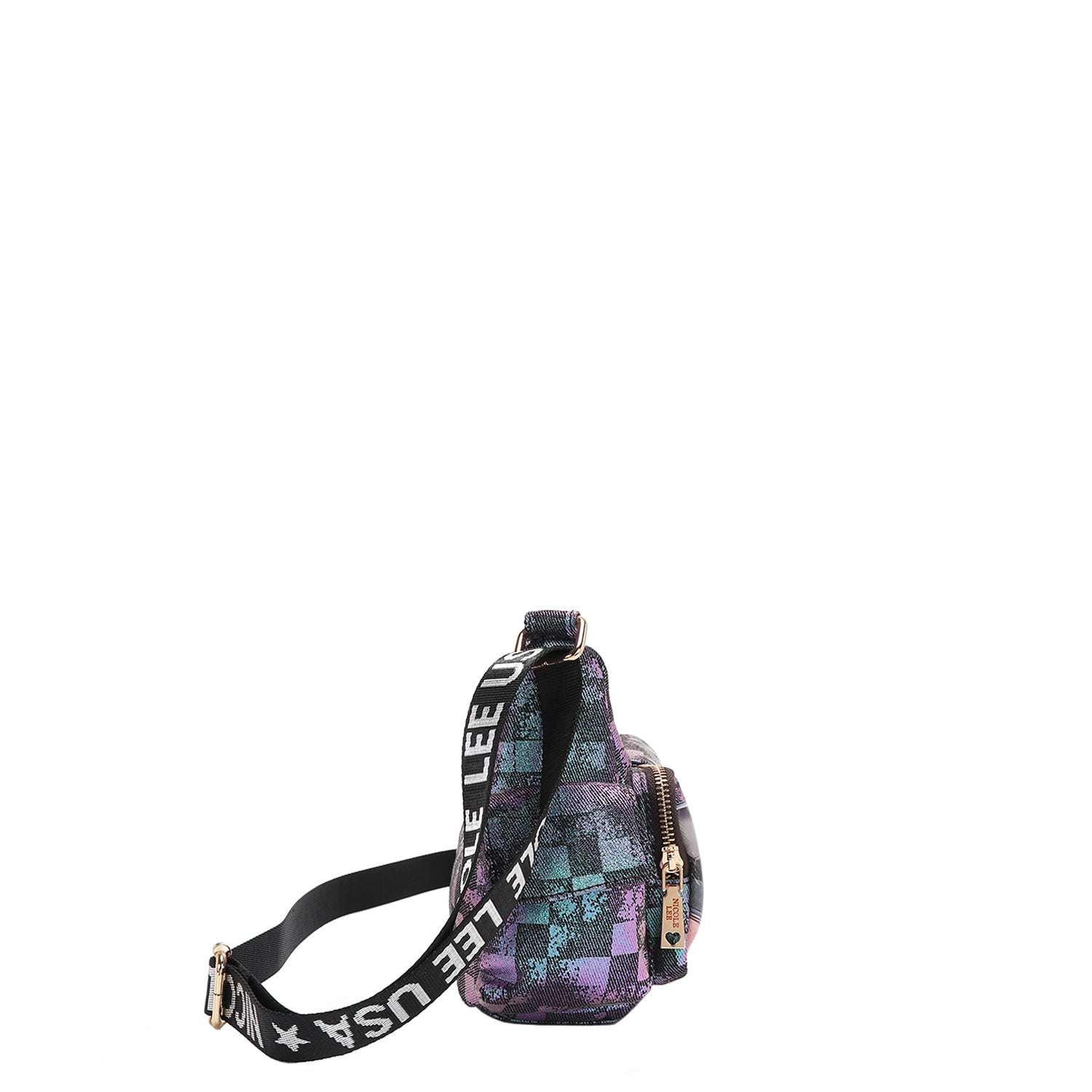 Discover our crescent-shaped checker denim shoulder bag, featuring all-around pockets for optimal organization and a sized-down interior perfect for carrying just the essentials.
