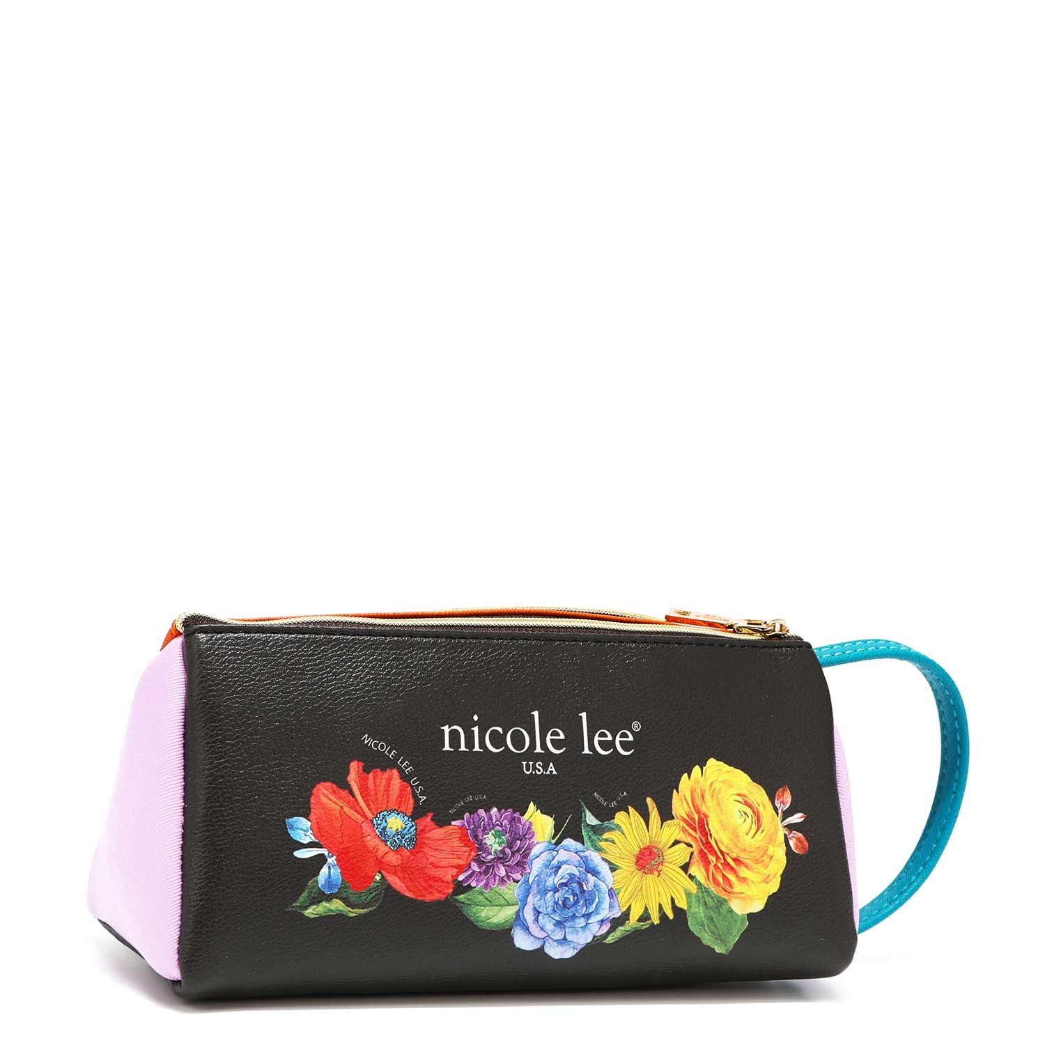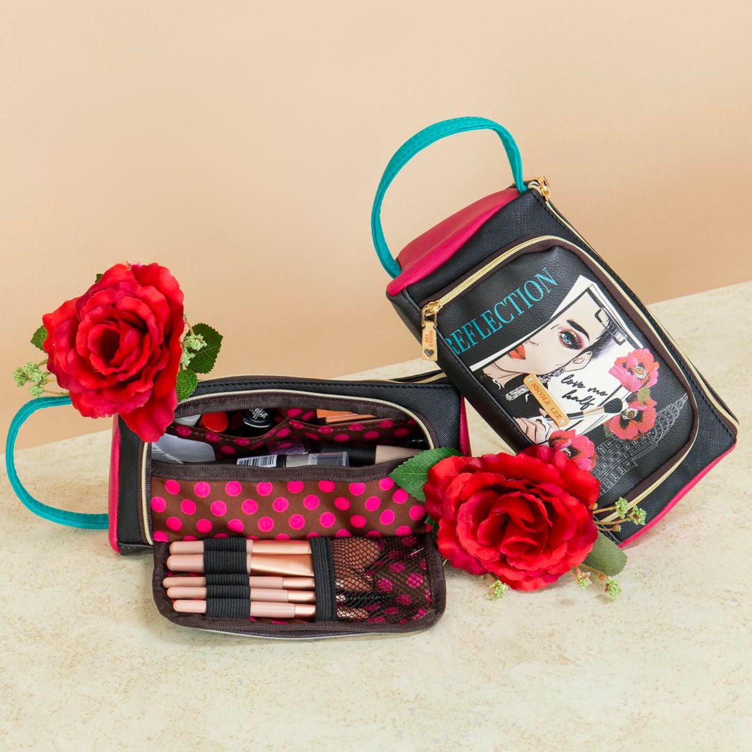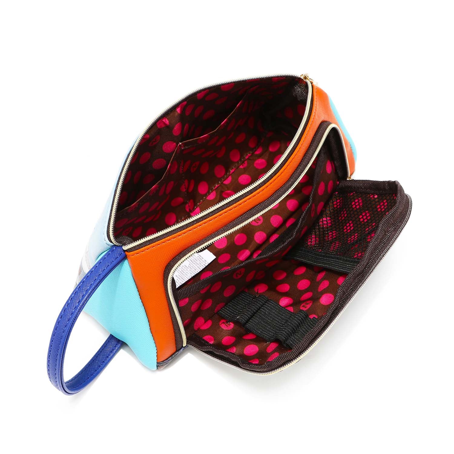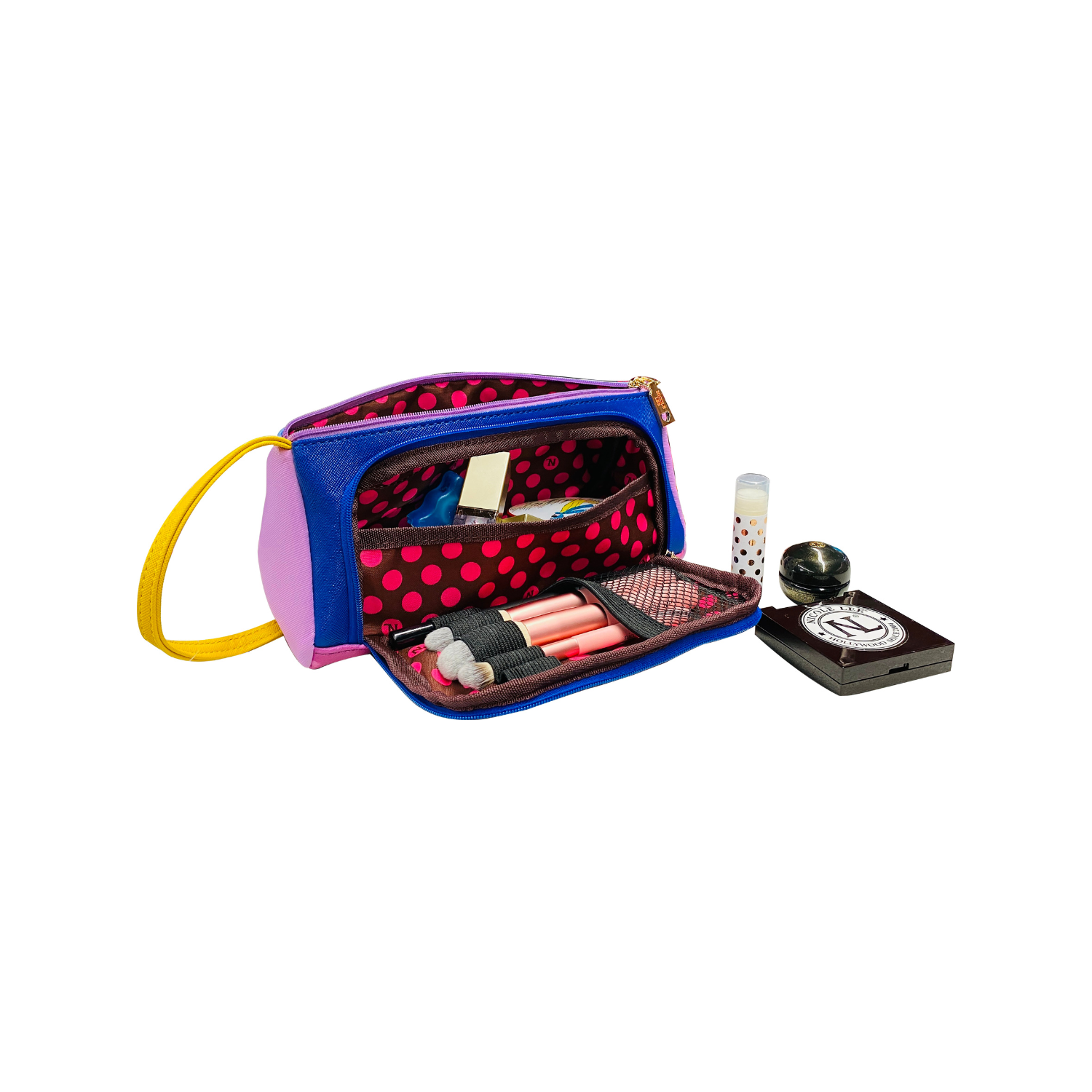 Chic and colorblocked, our cosmetic pouch opens up to a spacious interior with brush holders and plenty of pockets to store your makeup.