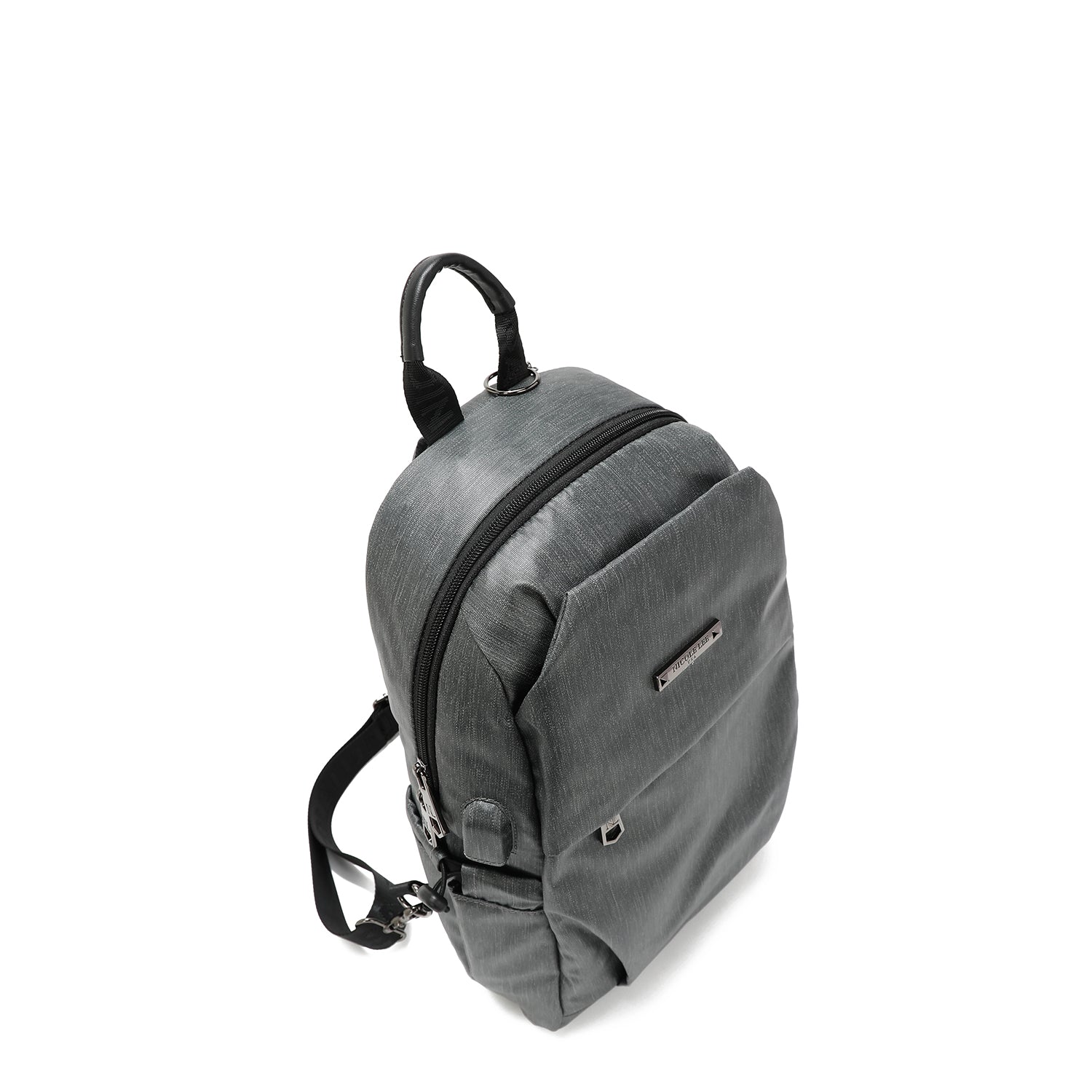 Connect the USB connector cable of your portable charger (not included) to the USB Charging port located on the side exterior of the backpack.