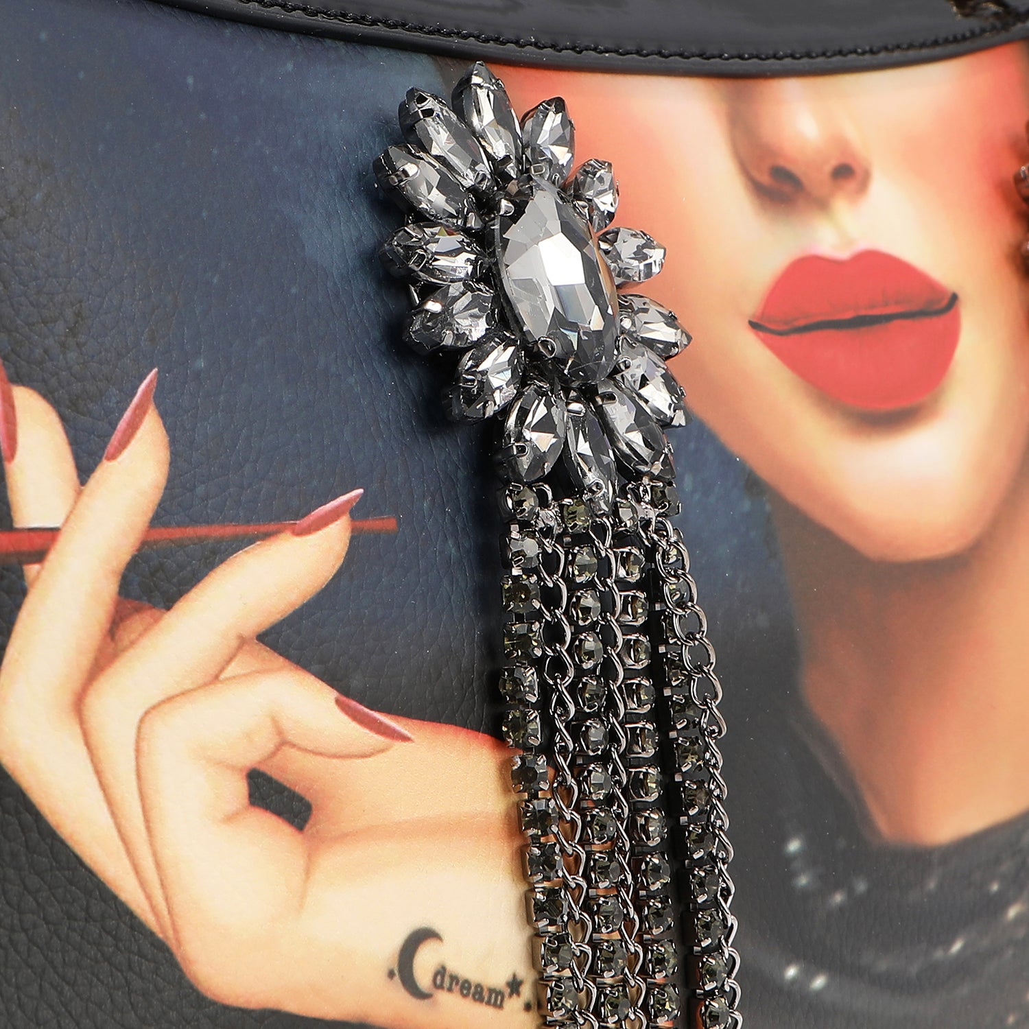 - Front is embellished with large rhinestone dangling earrings