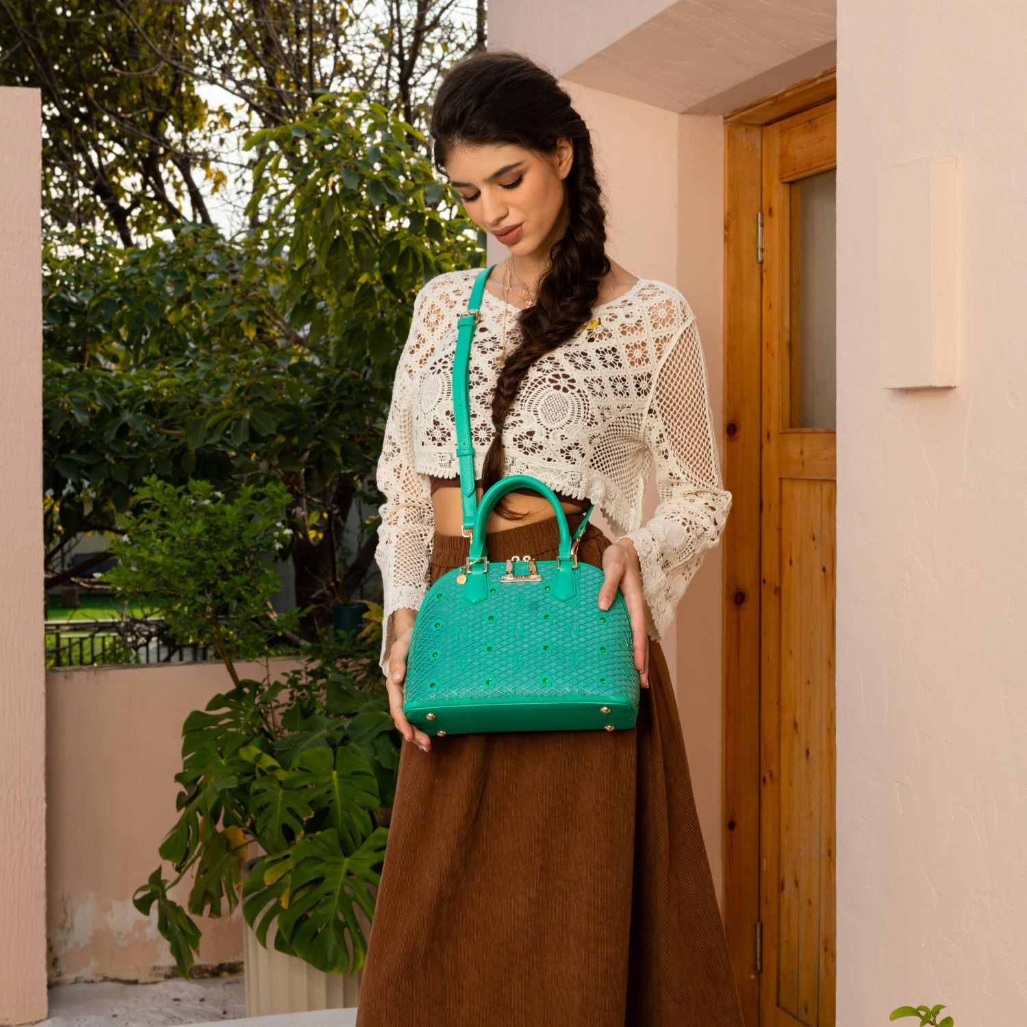 Sleek curves meet sharp craftsmanship in the Gracie dome satchel. Defined by its sculptural silhouette and signature laser-cut detailing, this bag is adorned with tonal rhinestones that add a subtle sparkle. Elegant top handles and a versatile crossbody strap make it the perfect companion for both polished daywear and chic evenings out.