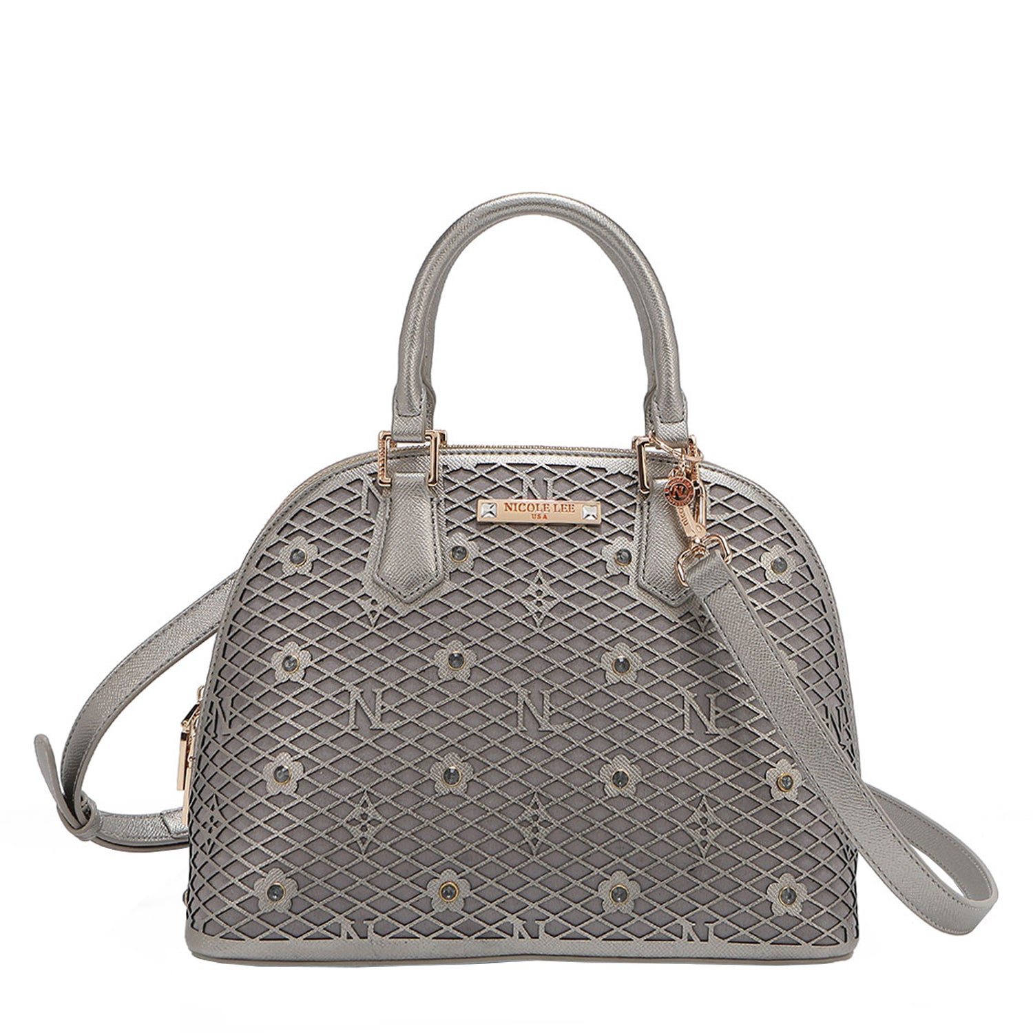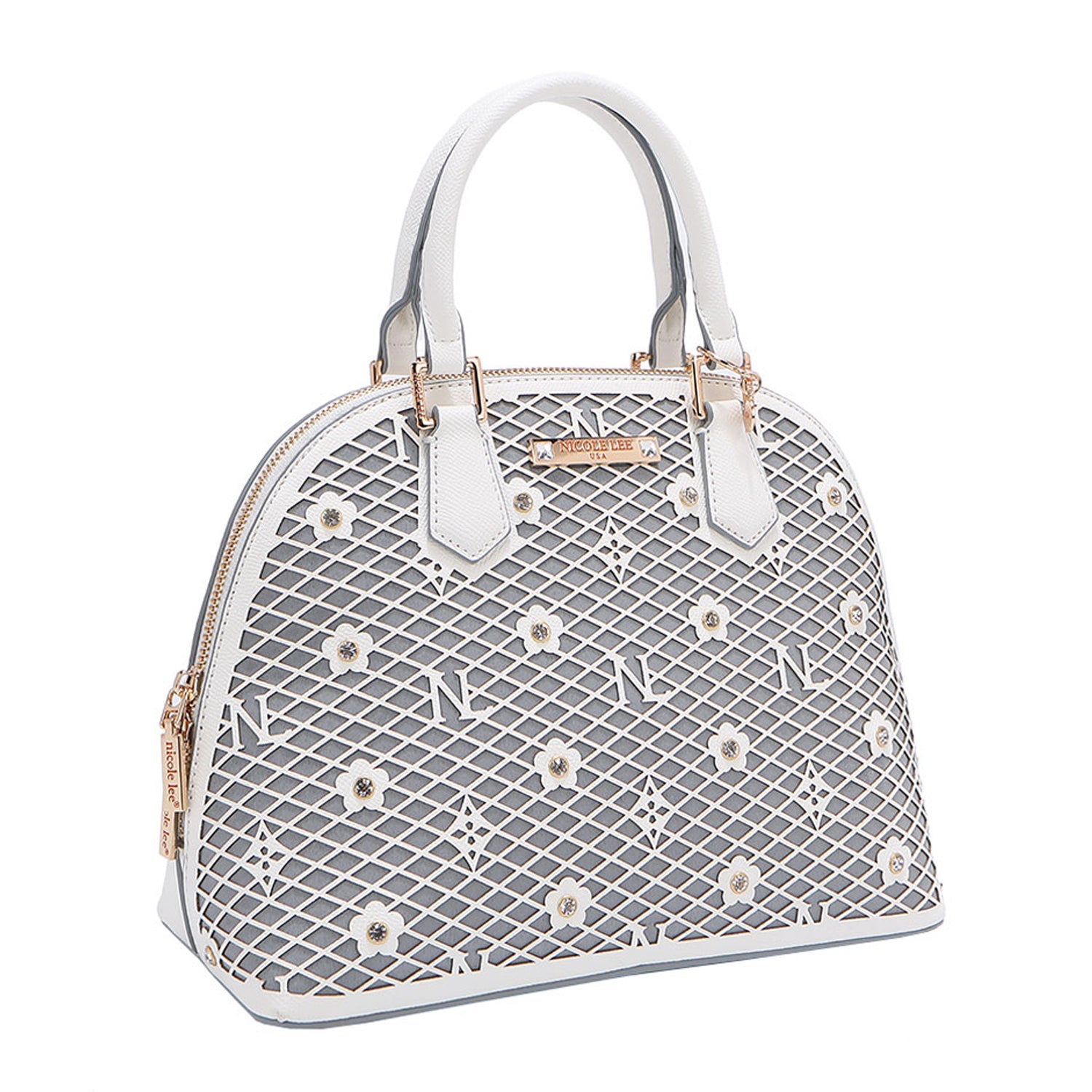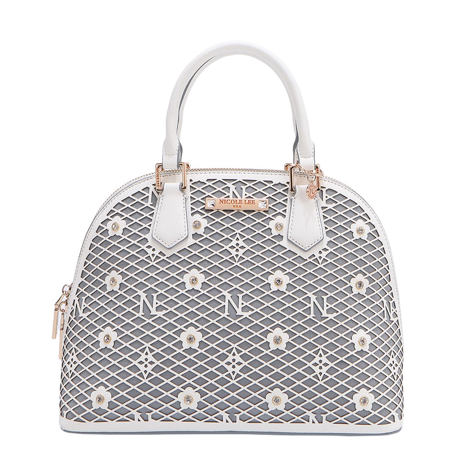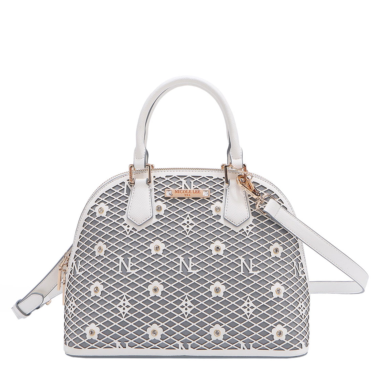 - Laser-cut flower and monogram pattern with diamond rhinestones