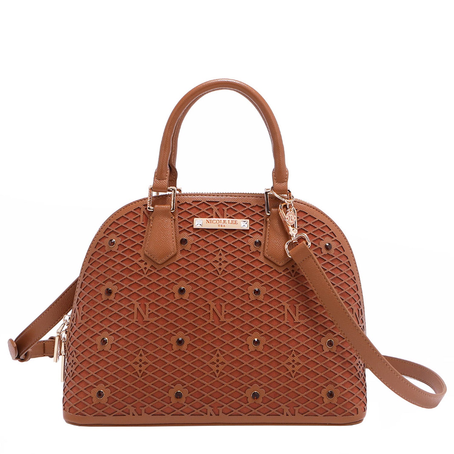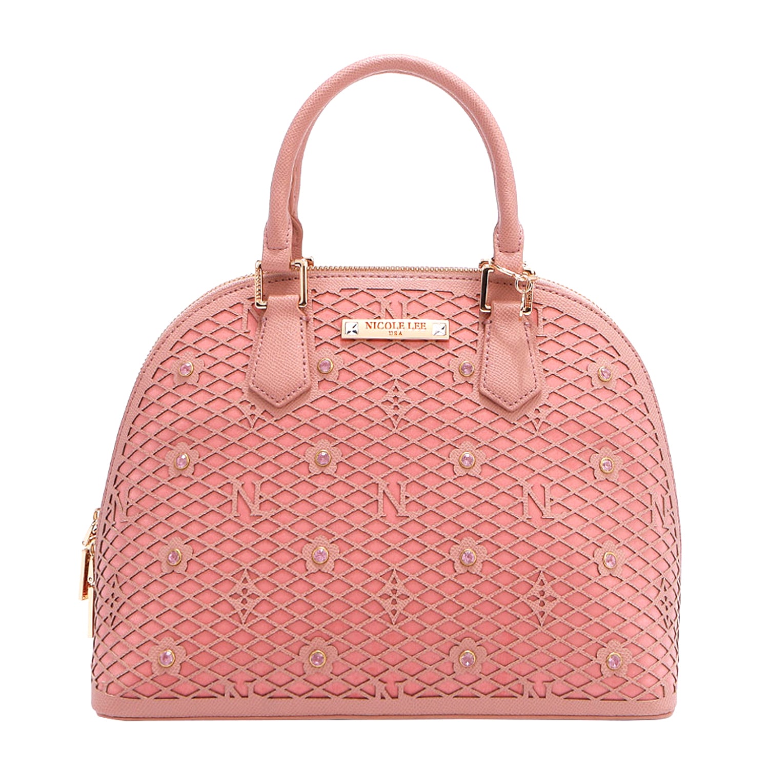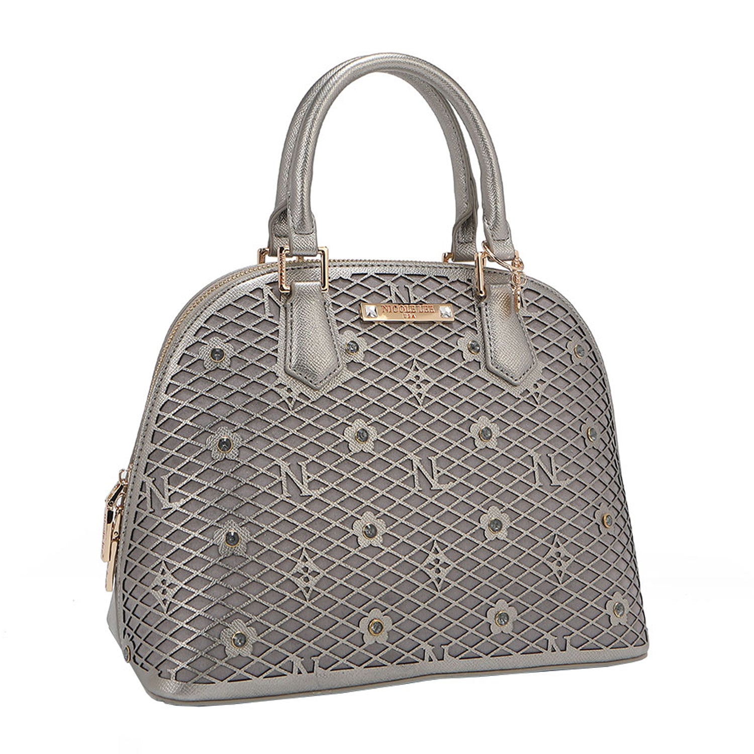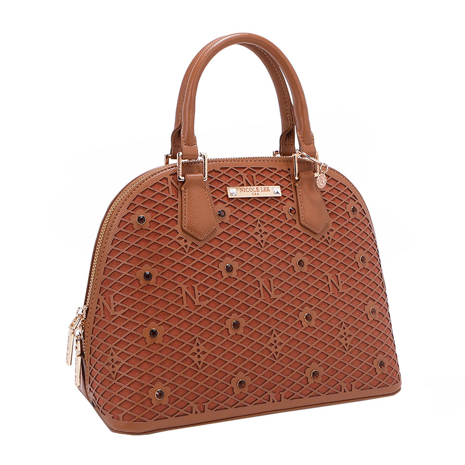- Laser-cut flower and monogram pattern with diamond rhinestones