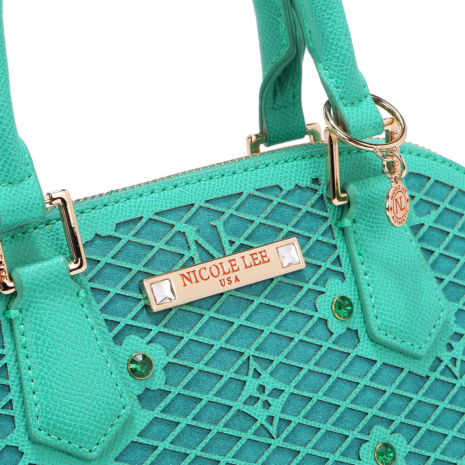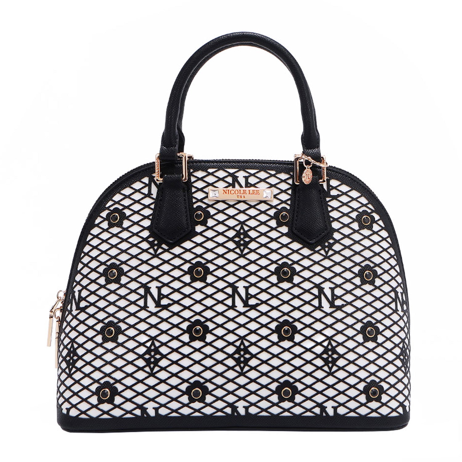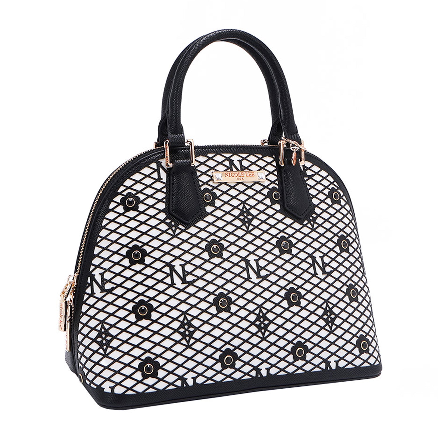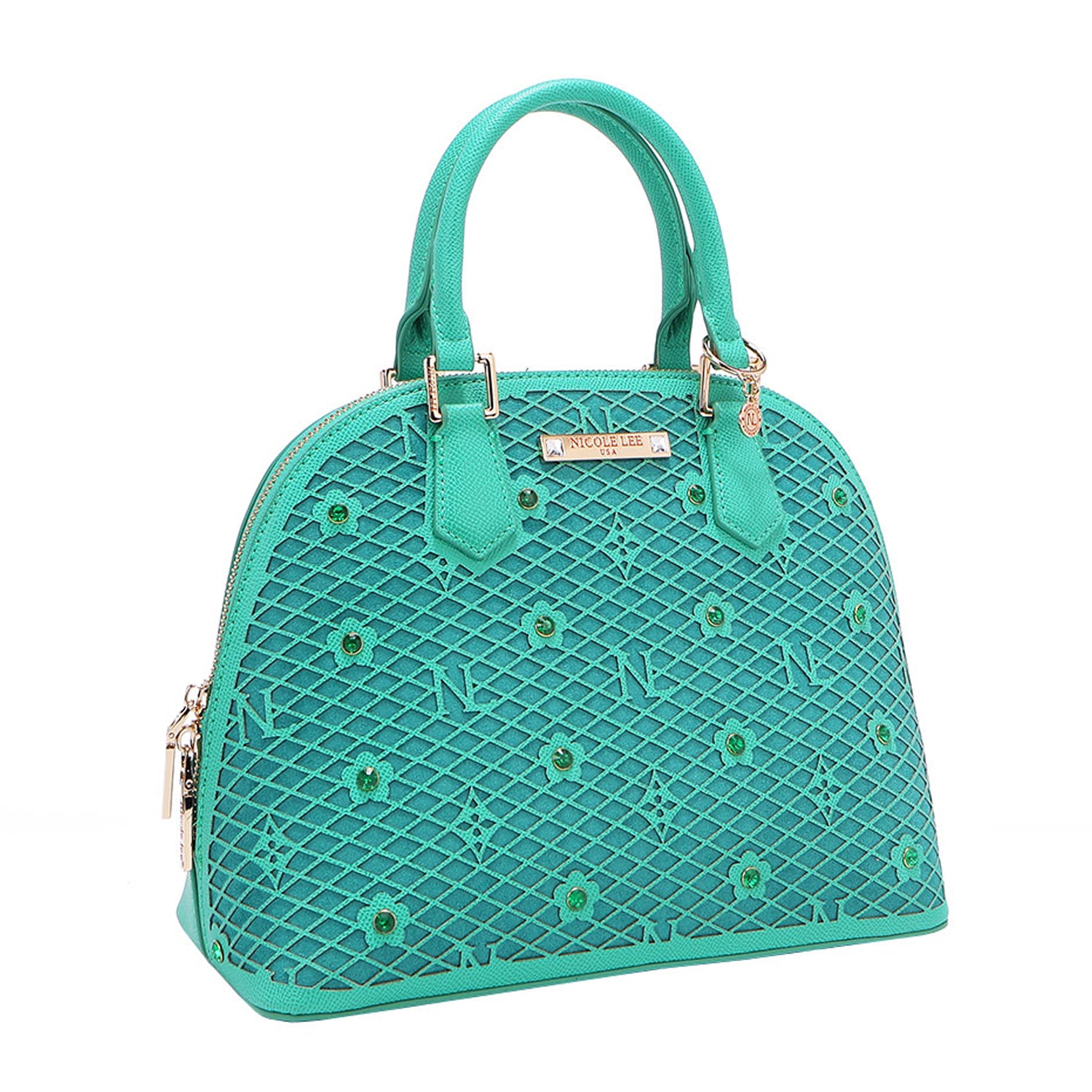 - Laser-cut flower and monogram pattern with diamond rhinestones