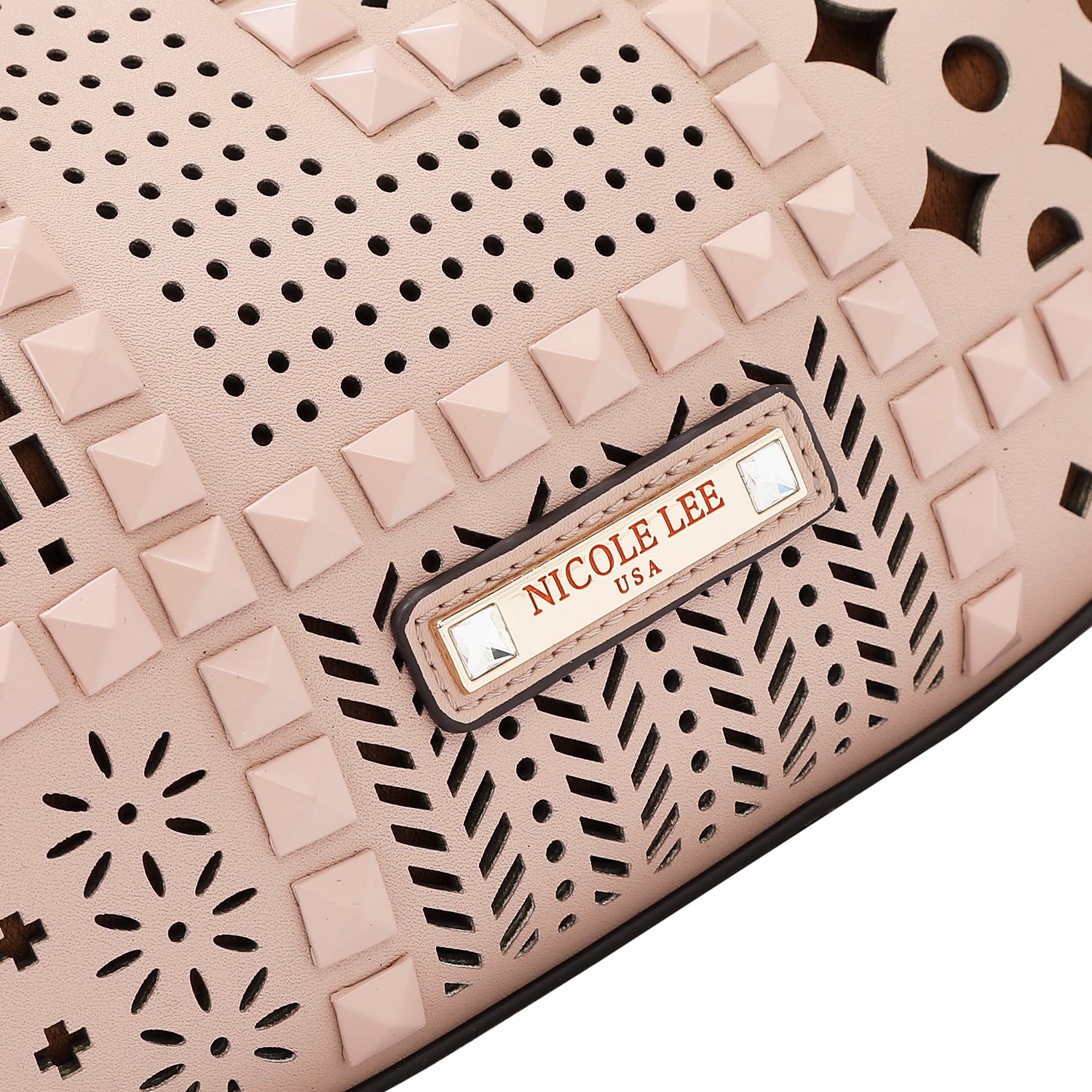 • Front is embellished with studs and laser cut design