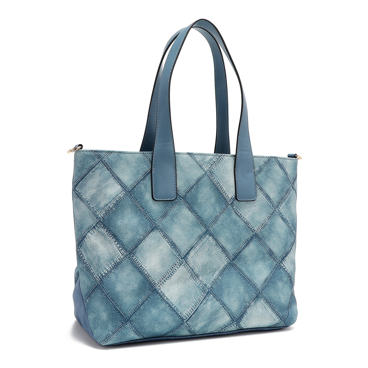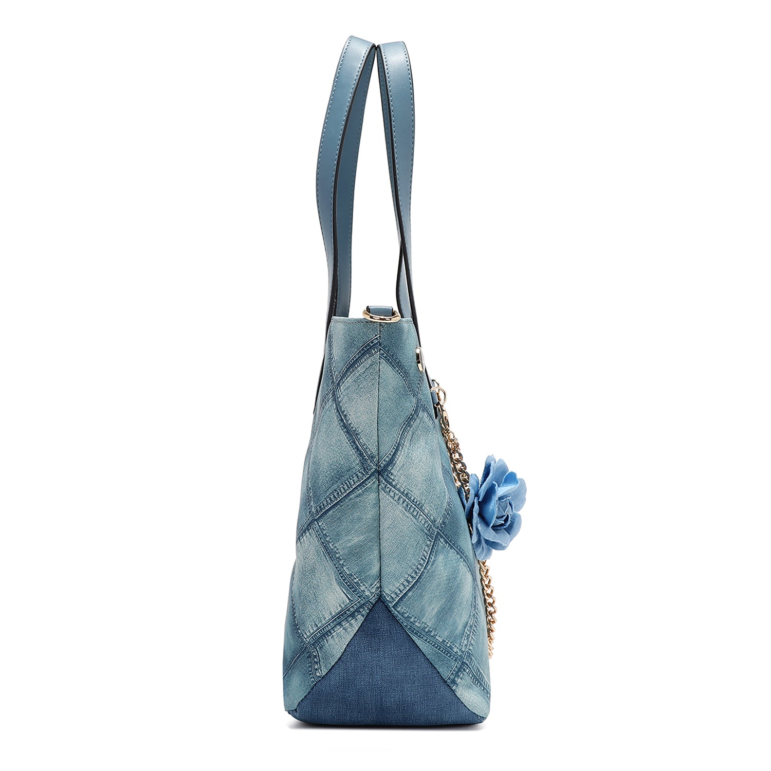 Meet your new favorite tote bag, perfect for work, the weekend, and everything in between. Crafted from vegan leather with a quilted patchwork pattern that mimics washed denim, this timeless beauty features a spacious interior for all your essentials. Add charm with the detachable pearl and gold chain-link strap, adorned with an elegant blue flower for the perfect finishing touch.