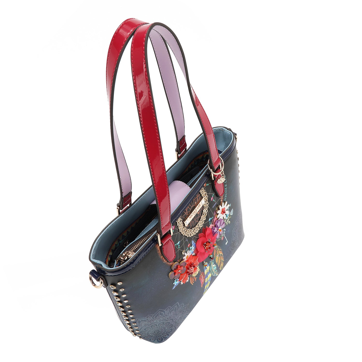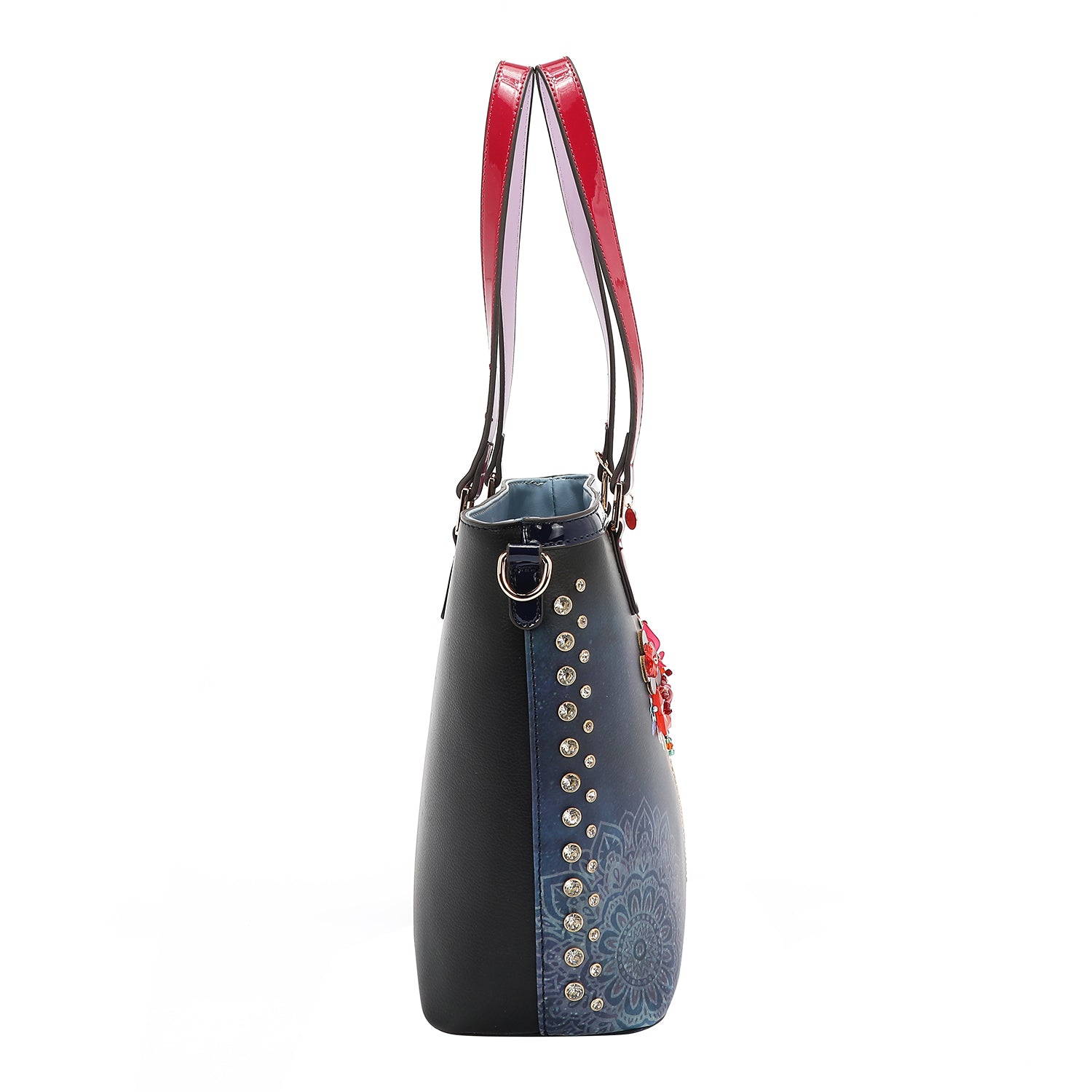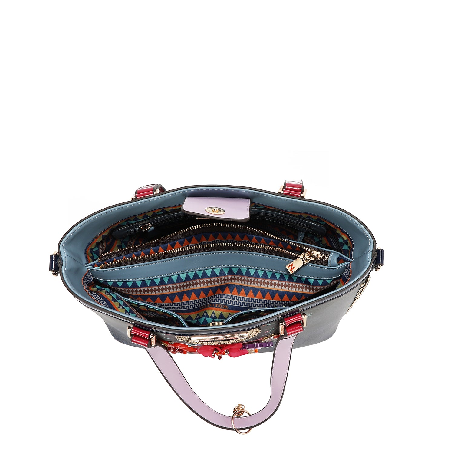 - Front is embellished with resin flowers, sequins, beads, and appliques