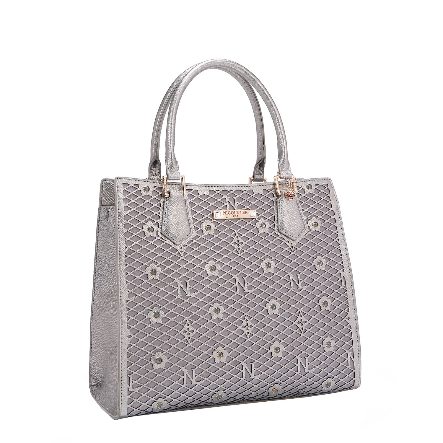 Make an impression with the Gracie structured tote — a refined design that commands attention. The architectural silhouette is elevated by meticulous laser-cut motifs and tonal rhinestones, making it a statement piece that transitions from desk to dinner with grace. Spacious enough for your daily essentials, this tote proves that beauty and practicality can go hand in hand.