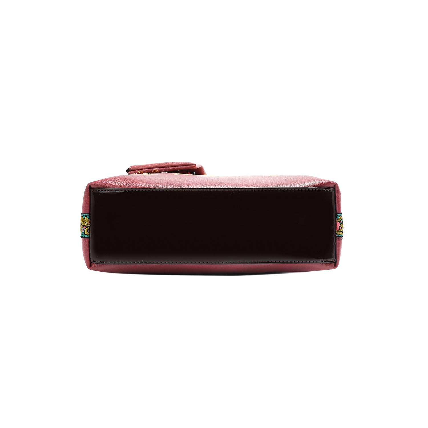 - Pebbled vegan leather exterior with glossy patent leather accents
