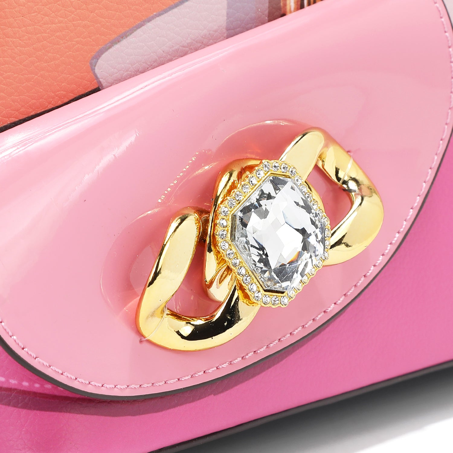 - Adjustable, detachable chain-link and vegan leather shoulder strap