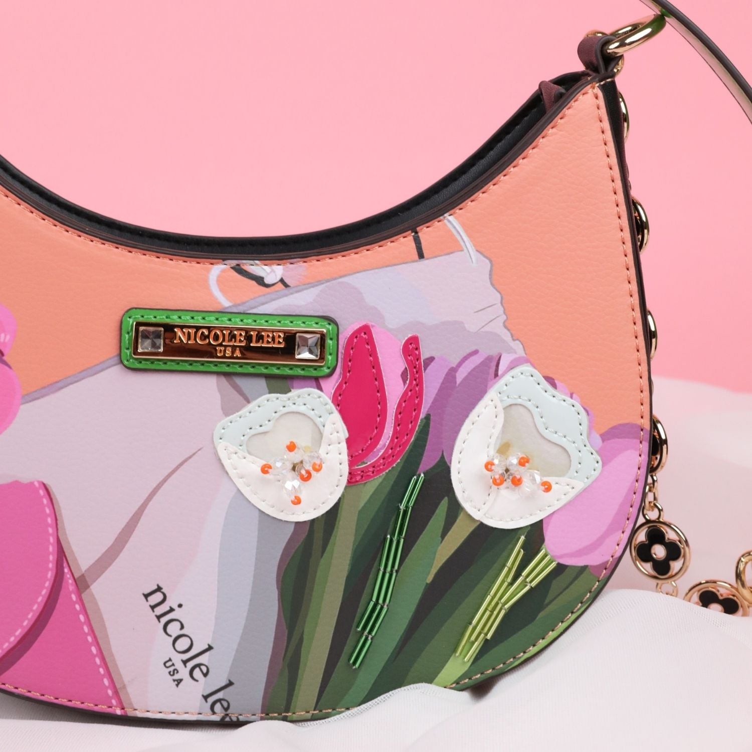Effortlessly refined yet undeniably bold, this statement piece exudes sophistication with a daring edge. Its sleek silhouette is beautifully accented by a luxe gold-tone chain-link and vegan leather shoulder strap, adorned with intricate black flower motifs that add a touch of romance and intrigue. A perfect balance of elegance and modern allure, this bag is destined to captivate.