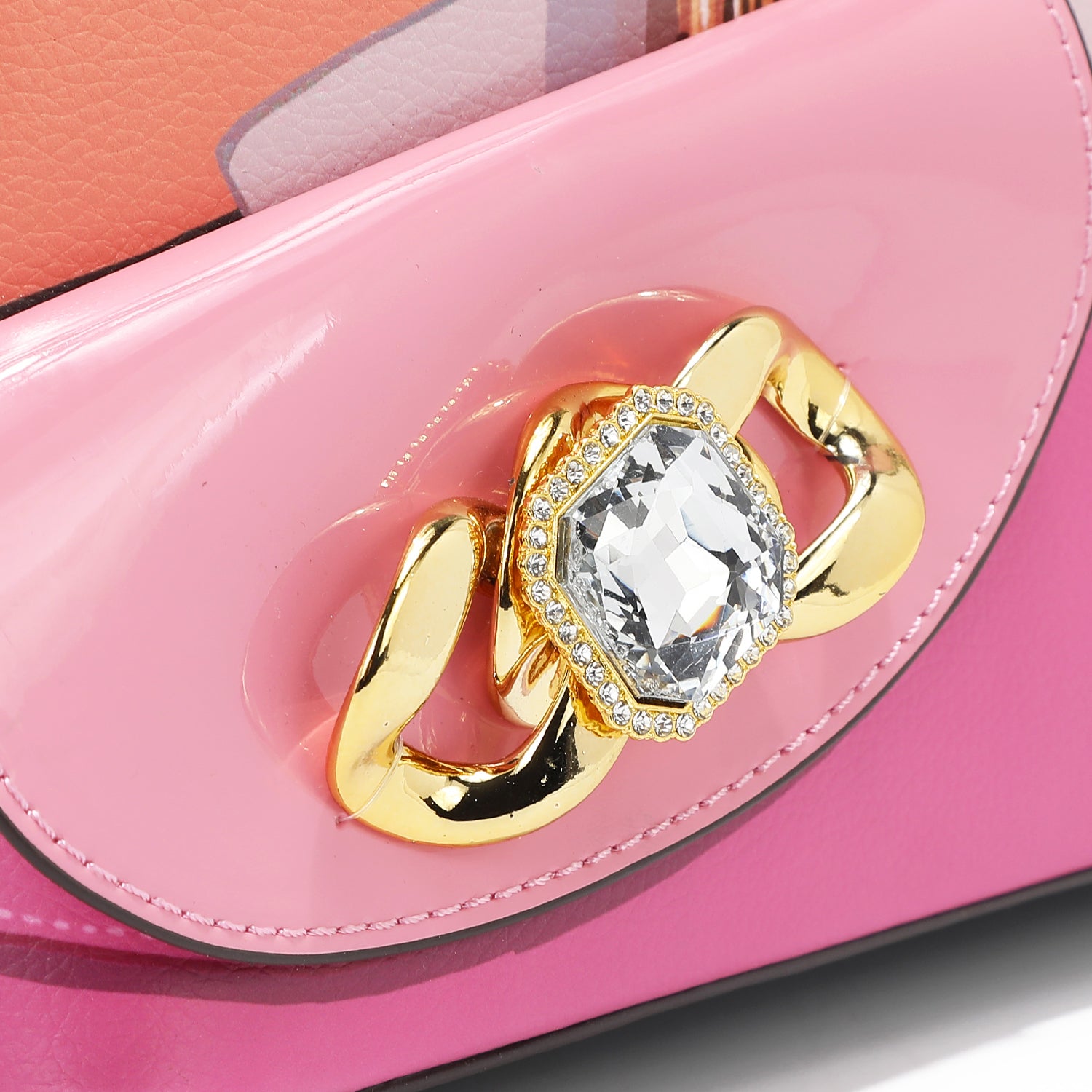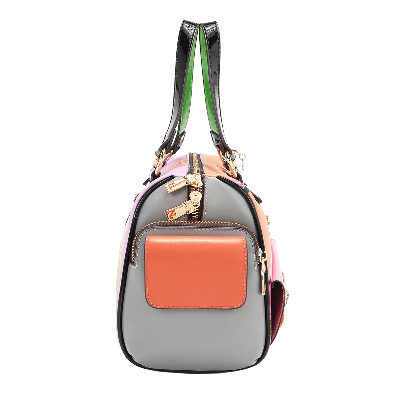 - Pebbled vegan leather exterior with glossy patent leather accents