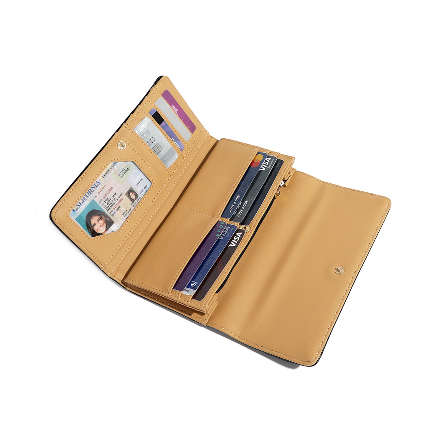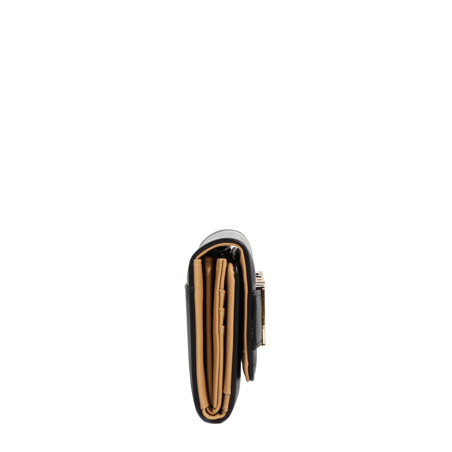 Elevate your essentials with our chic bifold flap wallet, featuring a bold NICOLE metal logo strap that doubles as a sleek clutch handle. With plenty of card slots and a zip compartment, it keeps everything organized in a timeless silhouette.