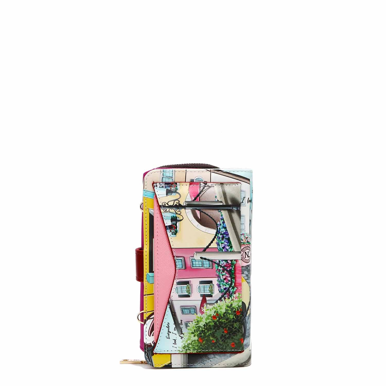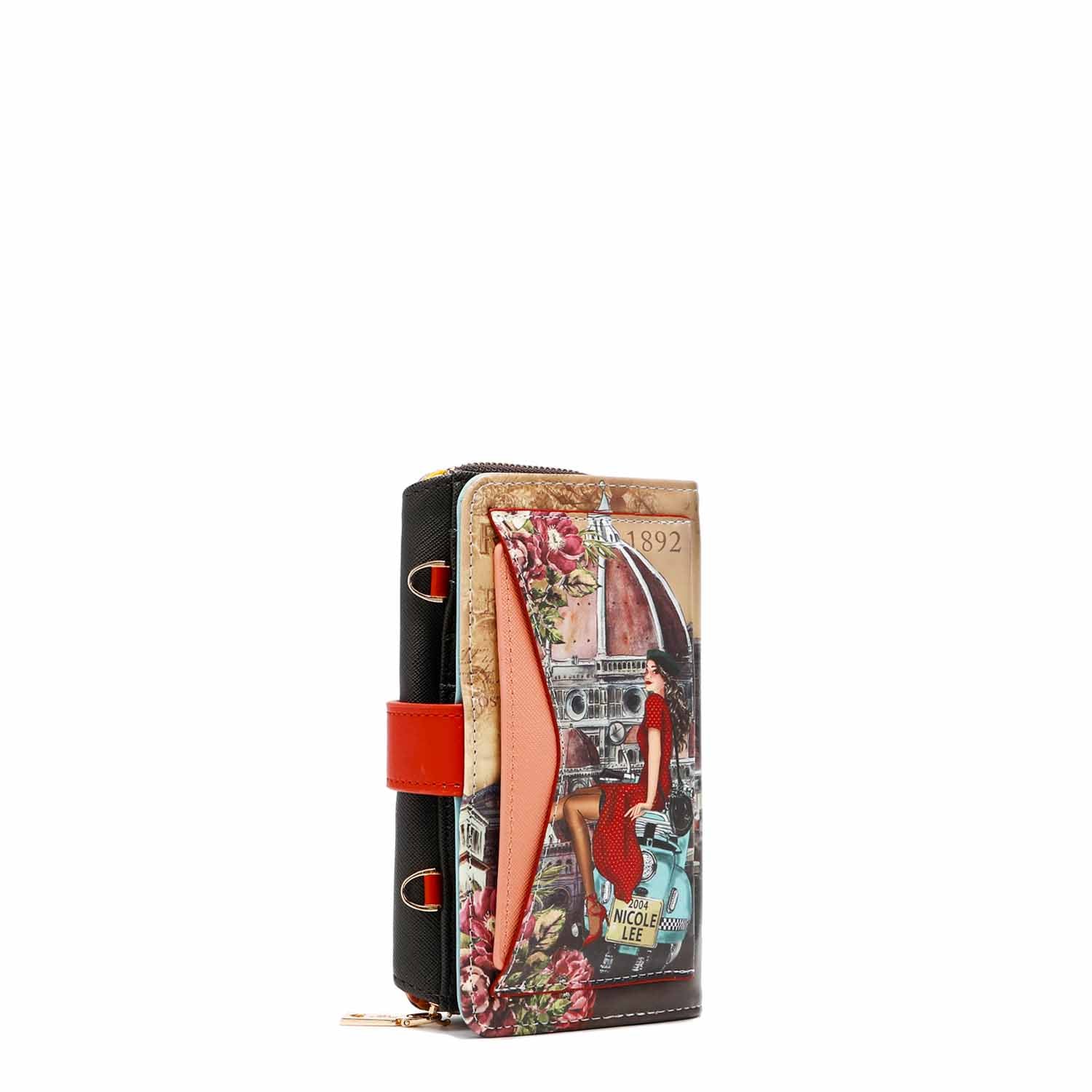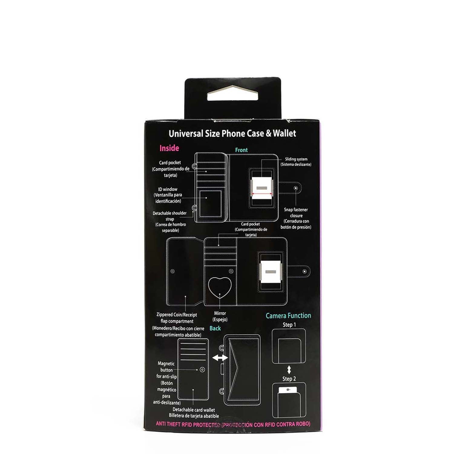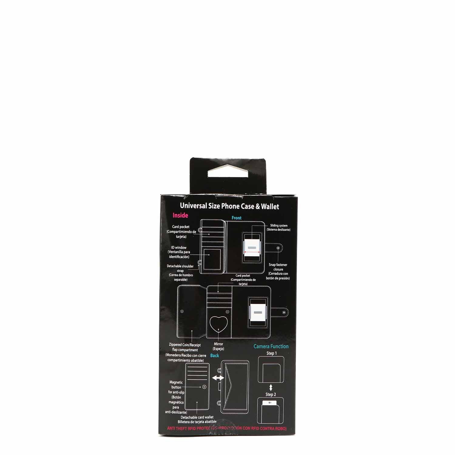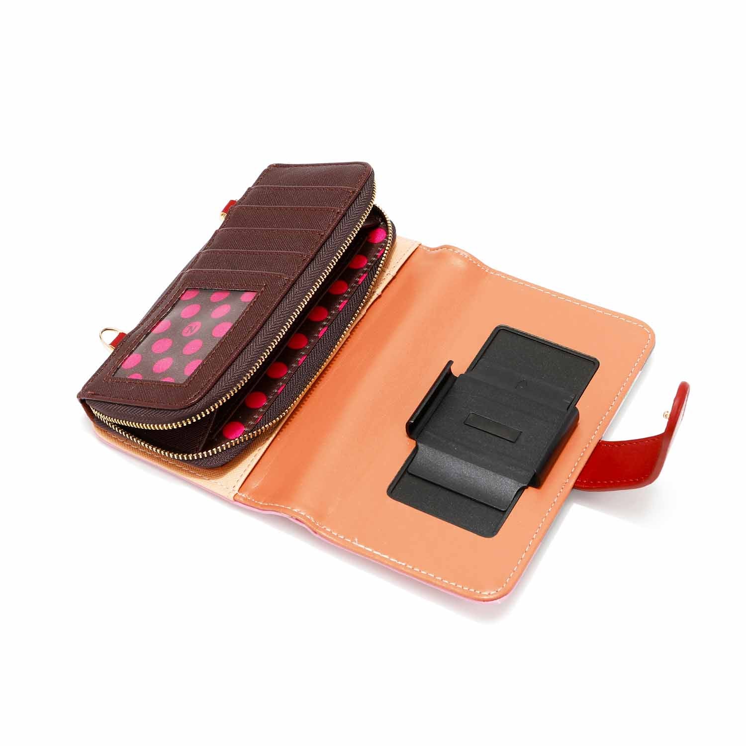 • Interior ID window, built-in heart-shaped mirror, 8 card slots, 2 note slots and adjustable, phone holder (one size fits most. Does not fit iPhone 12 Pro Max)