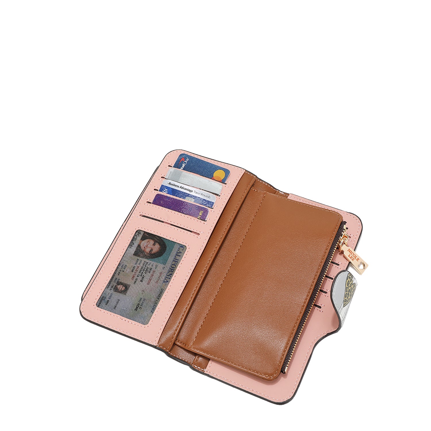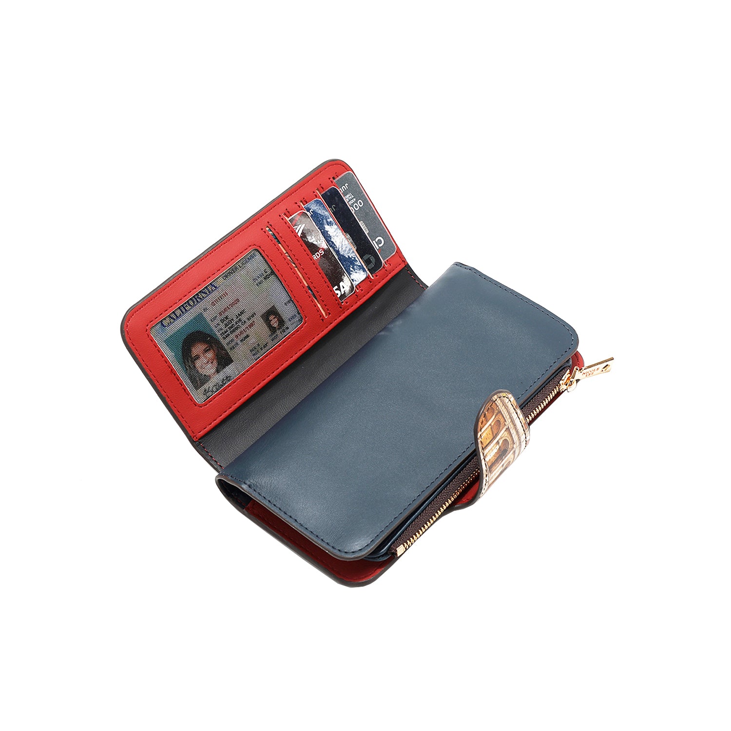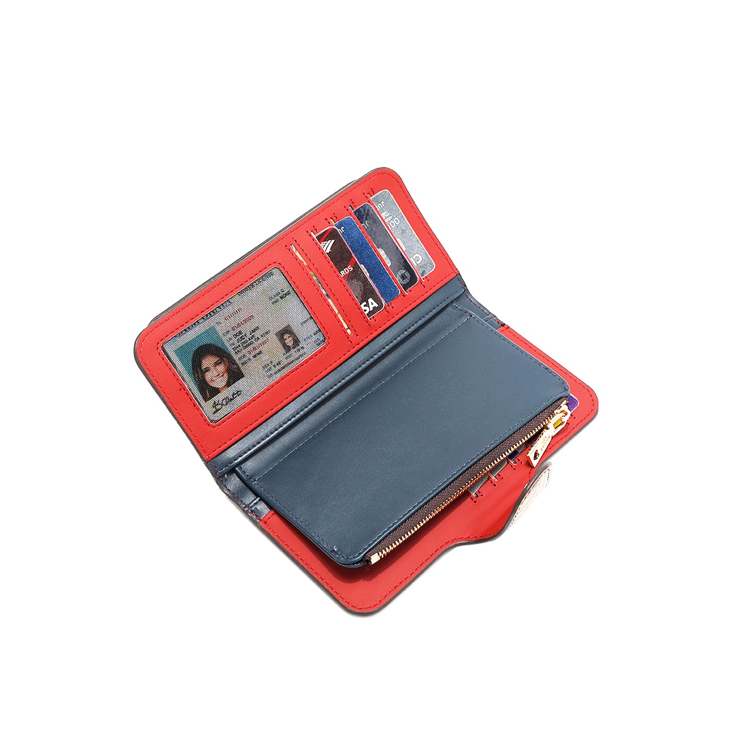 Experience ultimate organization with our layered wallet. Unfold it to reveal a bifold interior, complete with a center zip compartment that keeps your cash neatly organized and secure.